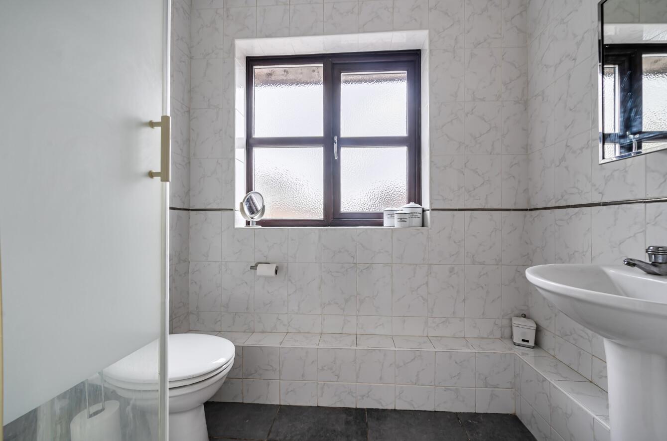En-Suite - Suite comprising shower cubicle, wash basin, WC, tiled walls and floor.