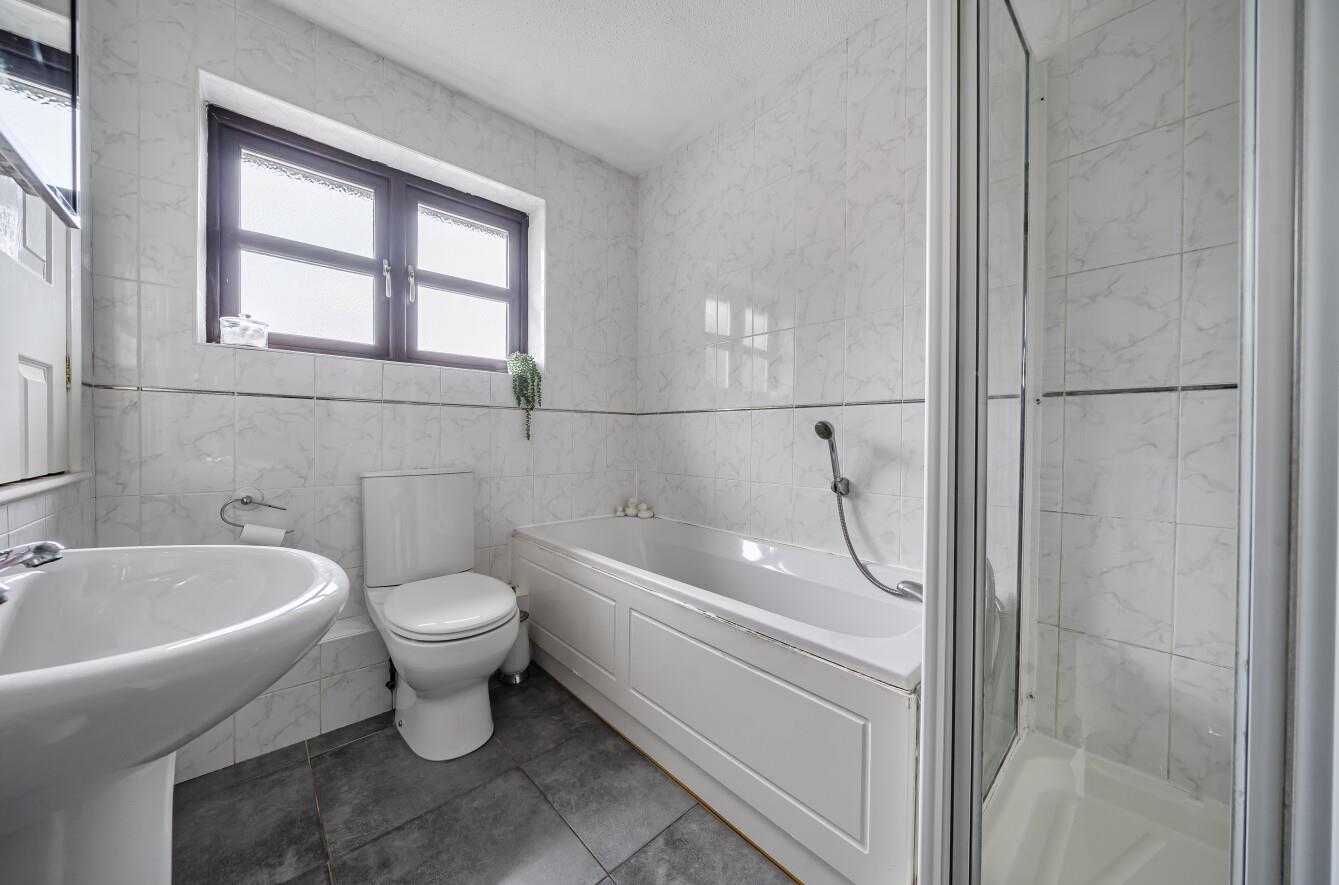 Bathroom: - Suite comprising bath with mixer tap and shower attachment, separate shower unit, wash basin, WC, storage cupboard, tiled walls and floor.