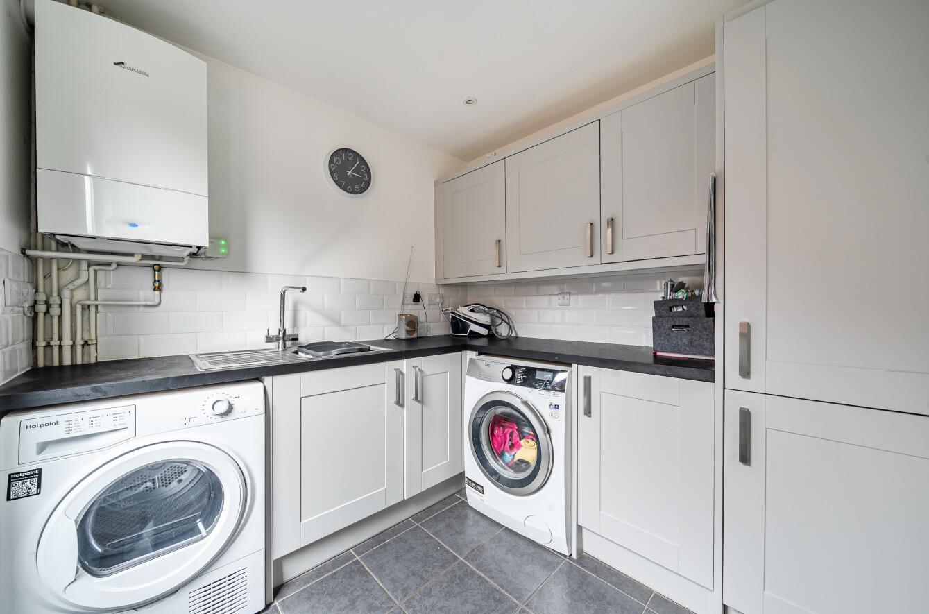 Utility: - 8'1" x 7'7" (2.47m x 2.30m) A range of matching cupboards, space and plumbing for appliances, boiler, tiled floor door to outside.
