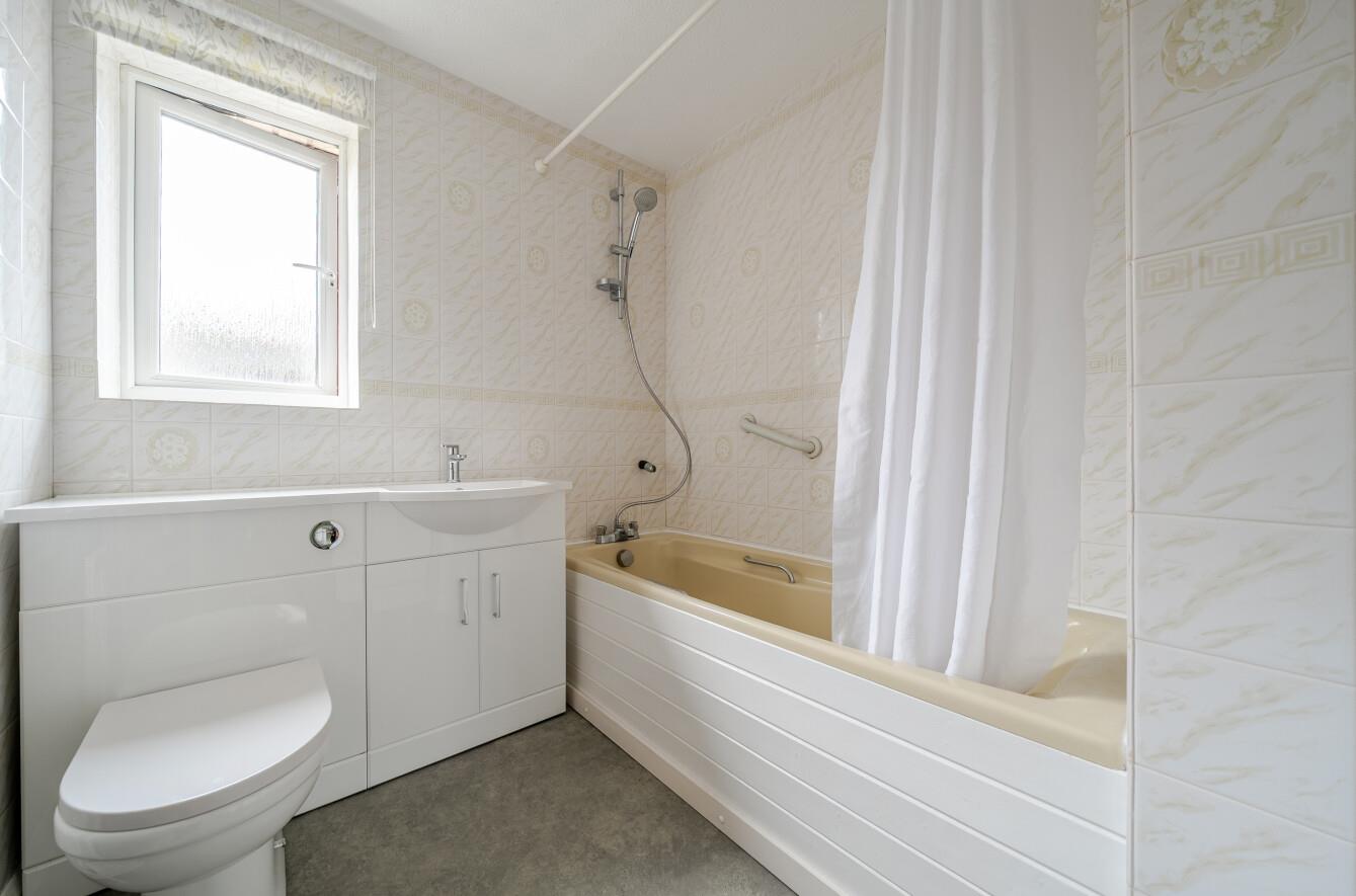 Bathroom: - Suite comprising bath with mixer tap and shower attachment, wash basin with cupboard under, WC, tiled walls.
