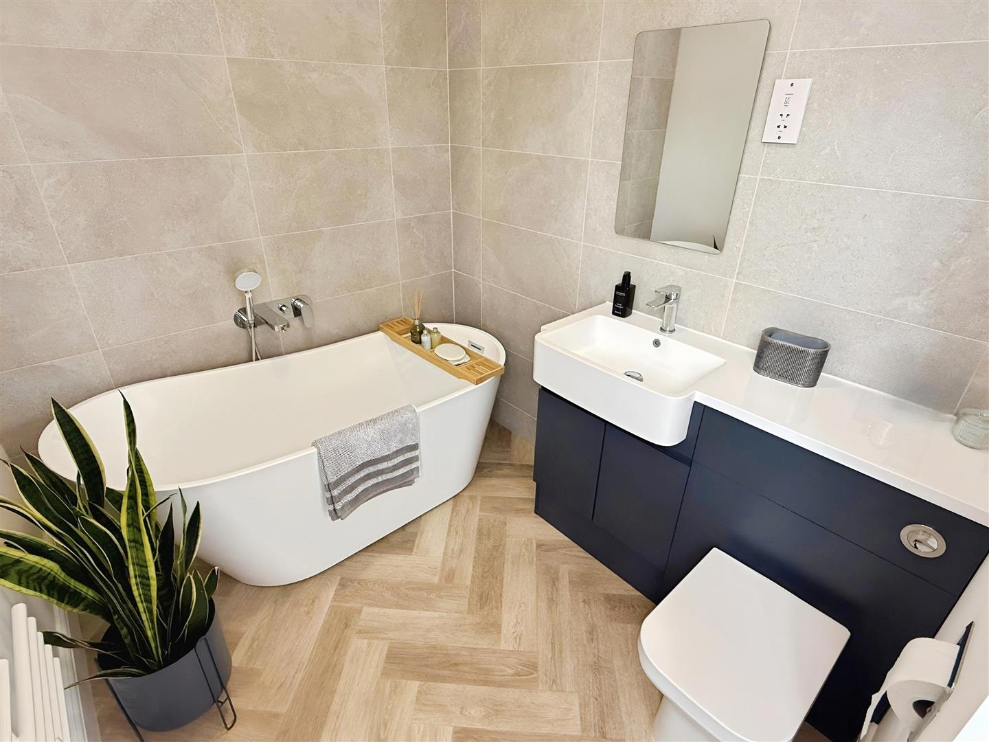 Bathroom - 3.12 x 1.85 max (10'2" x 6'0" max ) - Vinyl flooring. Heated towel rail. Obscured double glazed window. WC. Vanity style wash hand basin. Freestanding bath. Ceiling light.