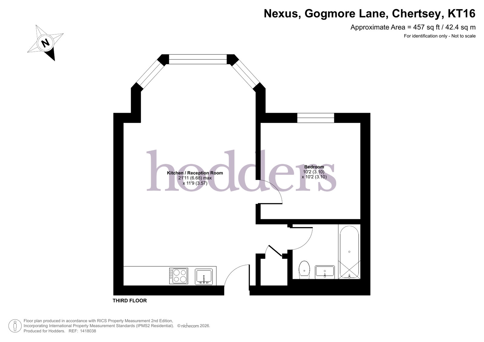 Located on the top-floor of this modern, ever-popular development is this very well-presented apartment, benefitting from allocated parking within a gated car park and ideally located just a stone's throw from historic and thriving Chertsey town centre boasting a variety of retail, leisure and hospitality options, as well as train station serving London Waterloo and also just a short drive to Junction 11 of the M25. The accommodation comprises of an open-plan living arrangement, but with the fully integrated kitchen feeling separate to the main home. The spacious feel is further heightened by the abundance of natural light from a large bay window which also provides far reaching views over neighbouring park and tree tops. The decor and quality of the fixtures and fittings exudes an air of class throughout. Adjacent to the living area is a luxurious three-piece shower and a master bedroom boasting fitted wardrobes with sliding doors. The development itself was converted in 2019 with the additional top floor added in the same period along with a lift service.