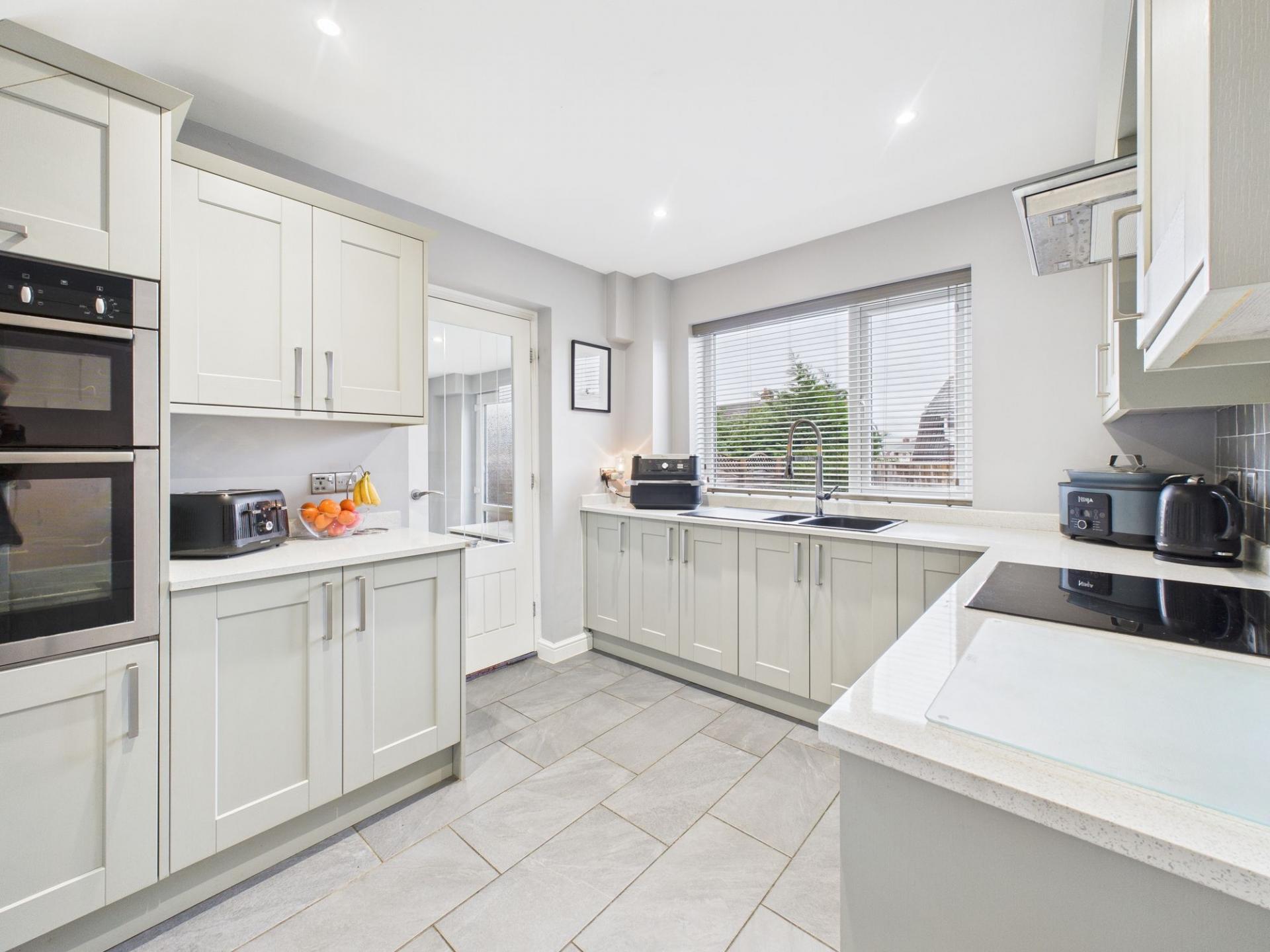 Inside, the ground floor boasts a bright and spacious dual-aspect lounge and dining area with French doors that open directly onto the rear garden. The heart of the home, the shaker-style kitchen, is beautifully designed and integrated with modern appliances. Adjacent to the kitchen, the practical utility room provides space for a washer and dryer and offers direct access to the rear garden.