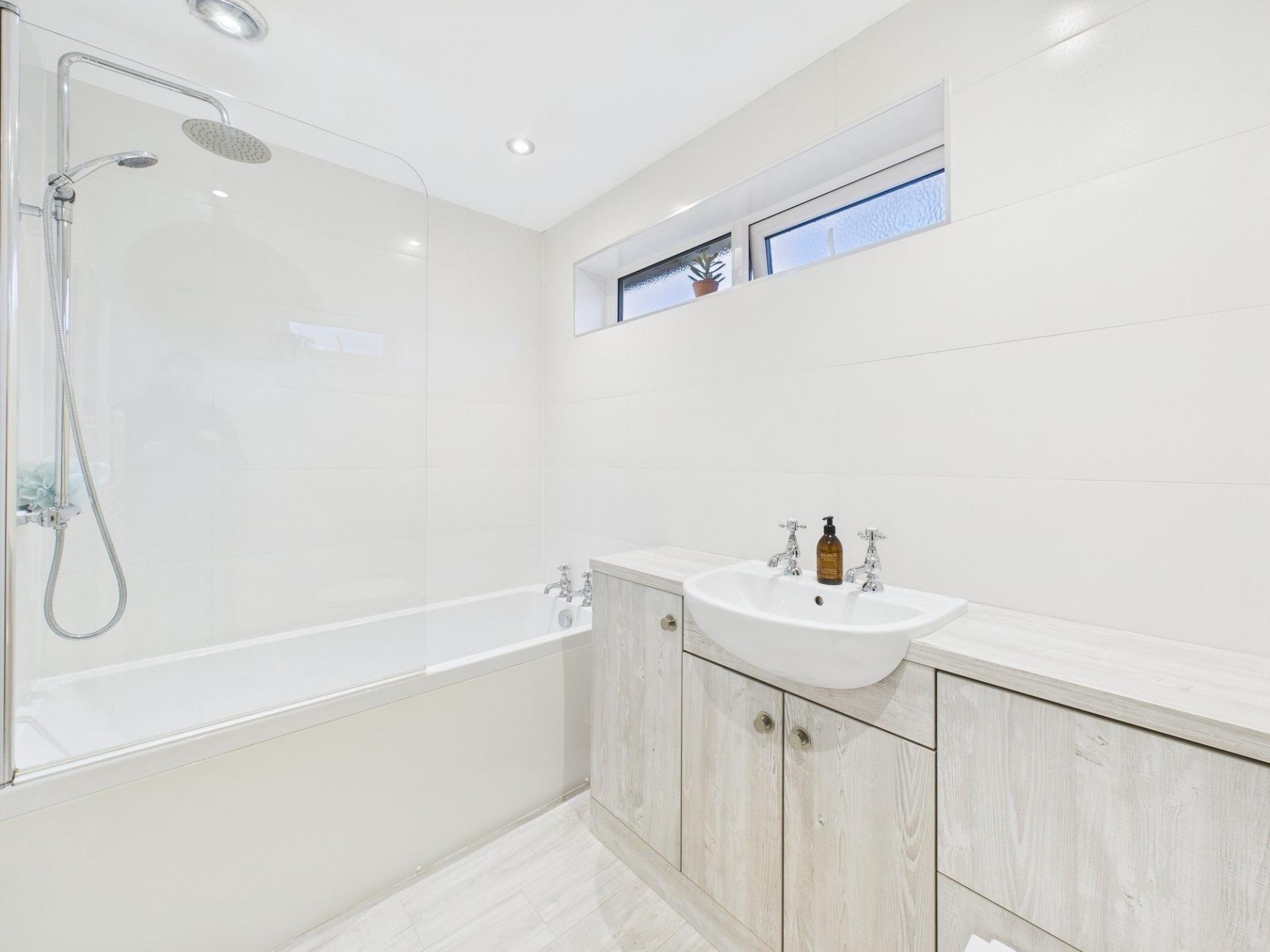 The stylish bathroom is fitted with modern furniture, including a low-level WC, a panelled bath with waterfall mixer shower and a heated towel rail.