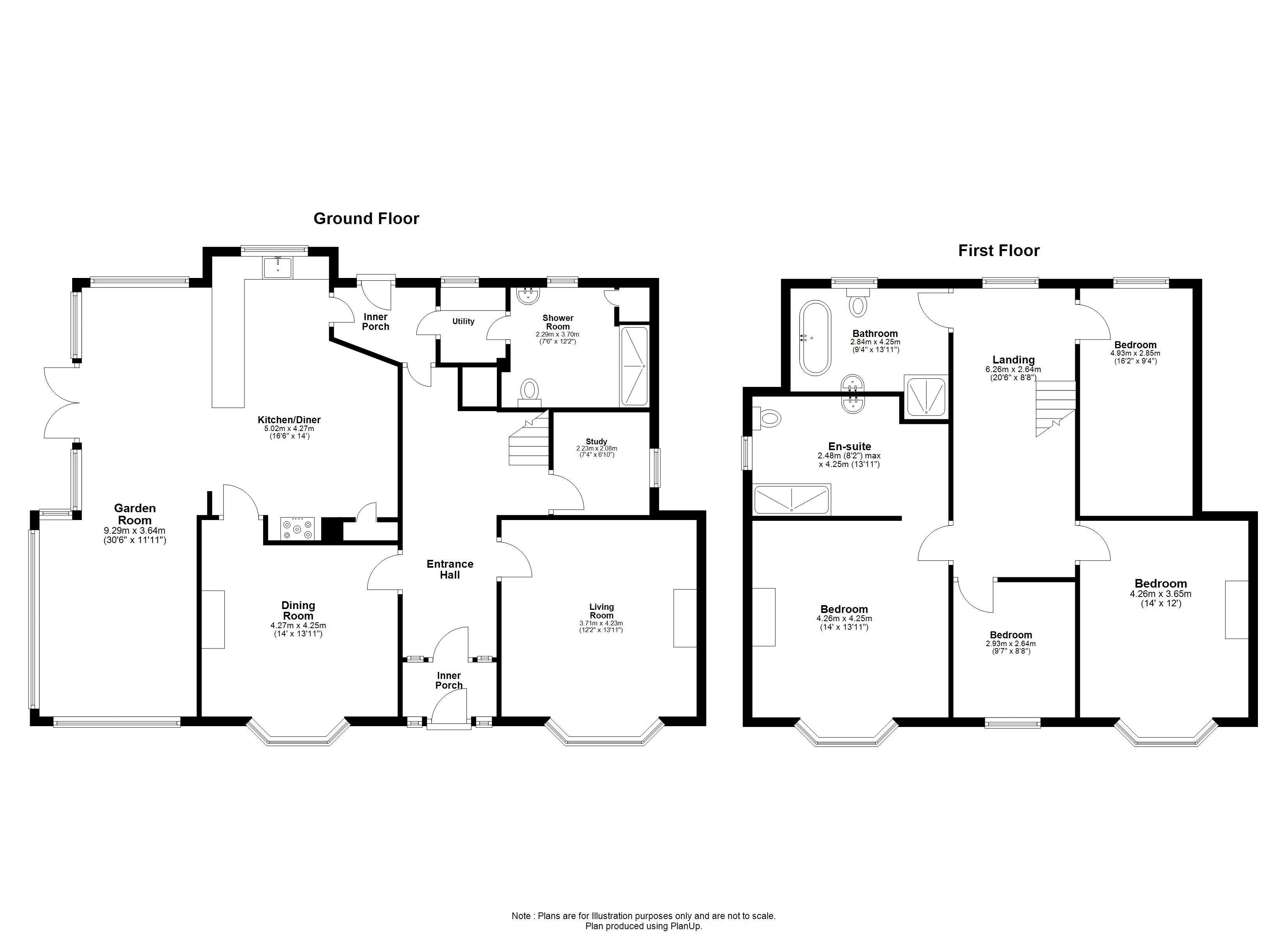 Upstairs, the principal bedroom is a sanctuary of charm, featuring a bay window, decorative period fireplace, and access to a spacious en-suite shower room. The second double bedroom also benefits from a bay window and a beautifully detailed traditional fireplace. Two further bedrooms are well-proportioned, and a generous four-piece family bathroom with a freestanding roll-top bath, shower enclosure, WC, and hand wash basin completes the first-floor layout.