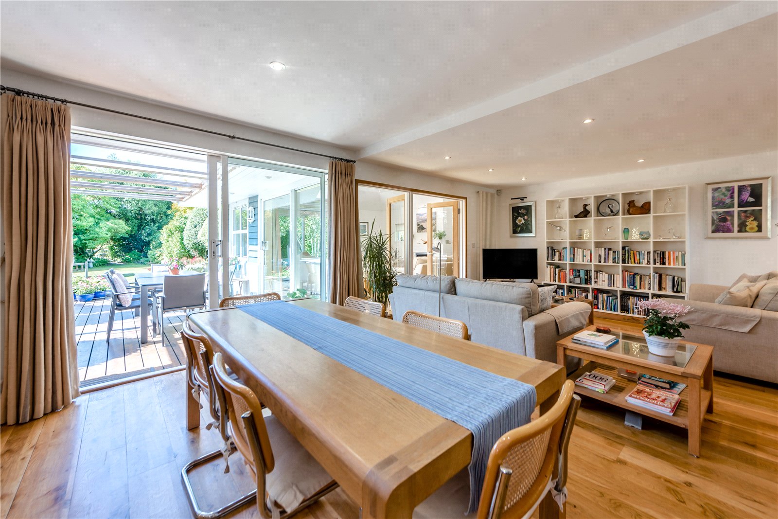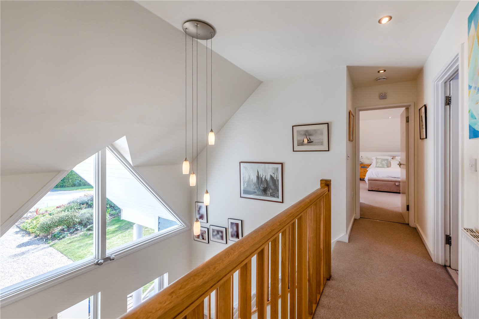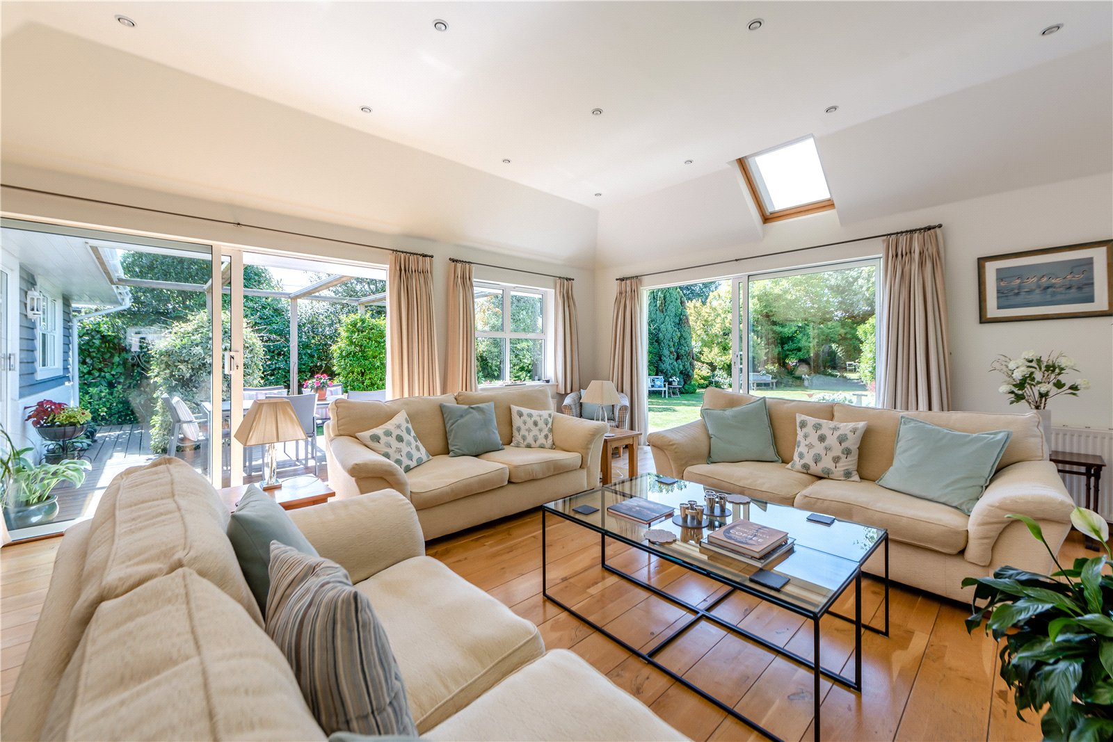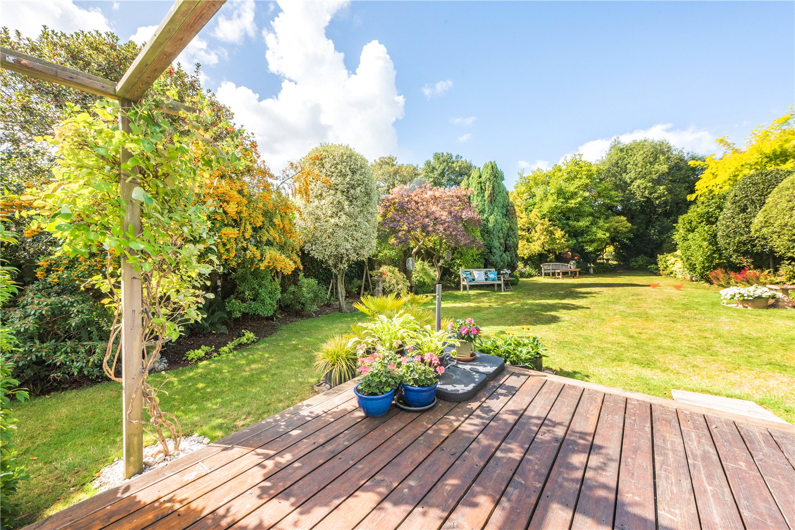 Set behind low stone flint wall, the property has strong kerb appeal and is approached via a gravelled driveway, allowing parking for several vehicles and boat storage, giving access to the double garage (with EV charging point) and attached workshop/store. The gardens, mainly laid to lawn with well-stocked borders and mature trees, include a covered front veranda that extends into a wraparound decked area accessed from the main reception rooms. Part-covered by a timber pergola, this space is ideal for entertaining and al fresco dining.The generous secluded rear garden also o?ers multiple seating areas, a timber store, a water feature and a large wraparound decked area with pergola, all overlooking the grounds and Chichester Harbour beyond, with direct access to the harbour pathway for walking, cycling and birdwatching.
