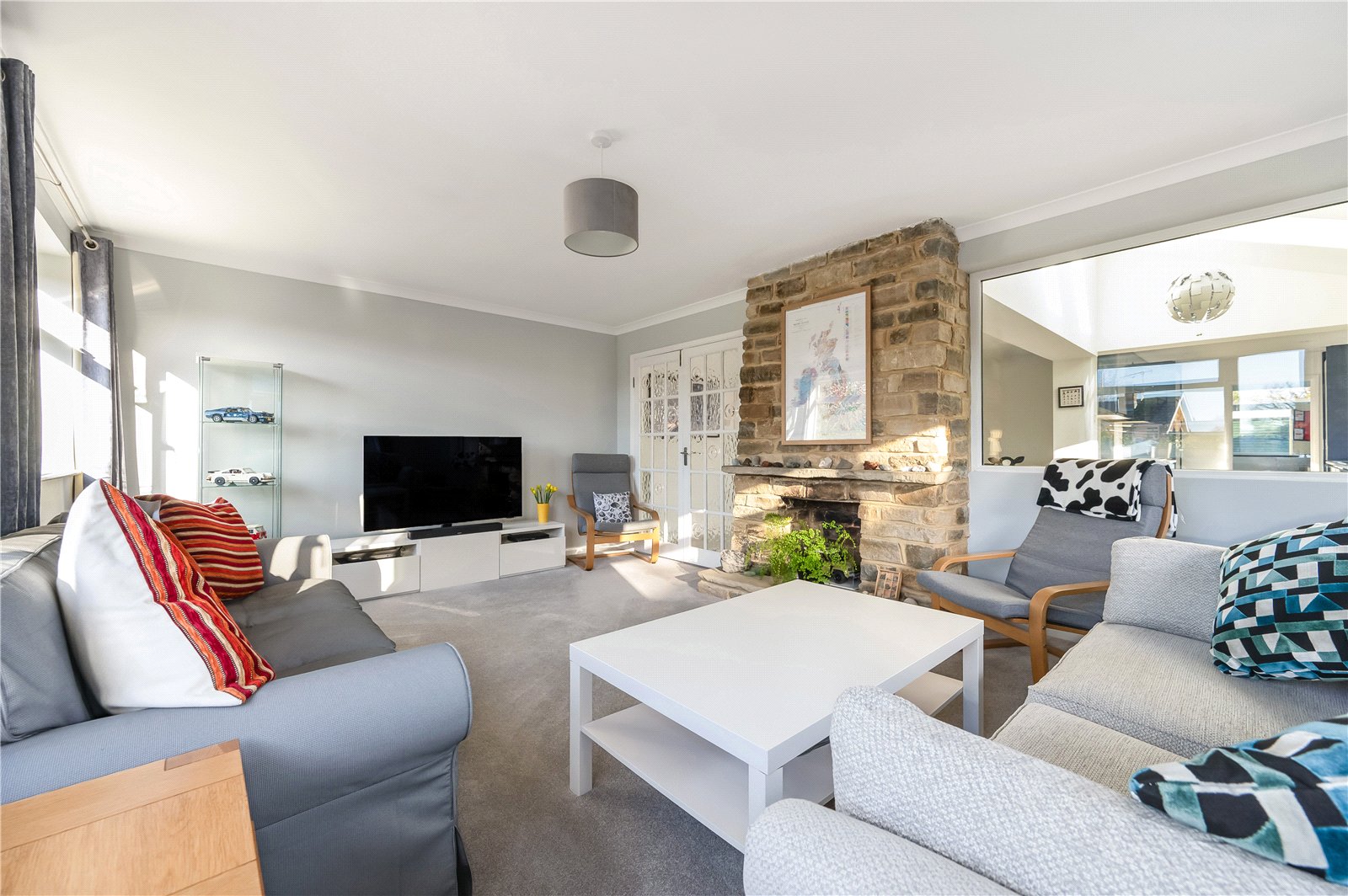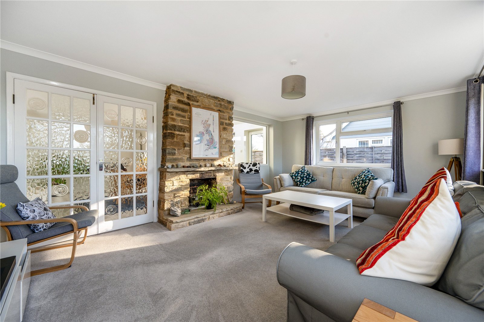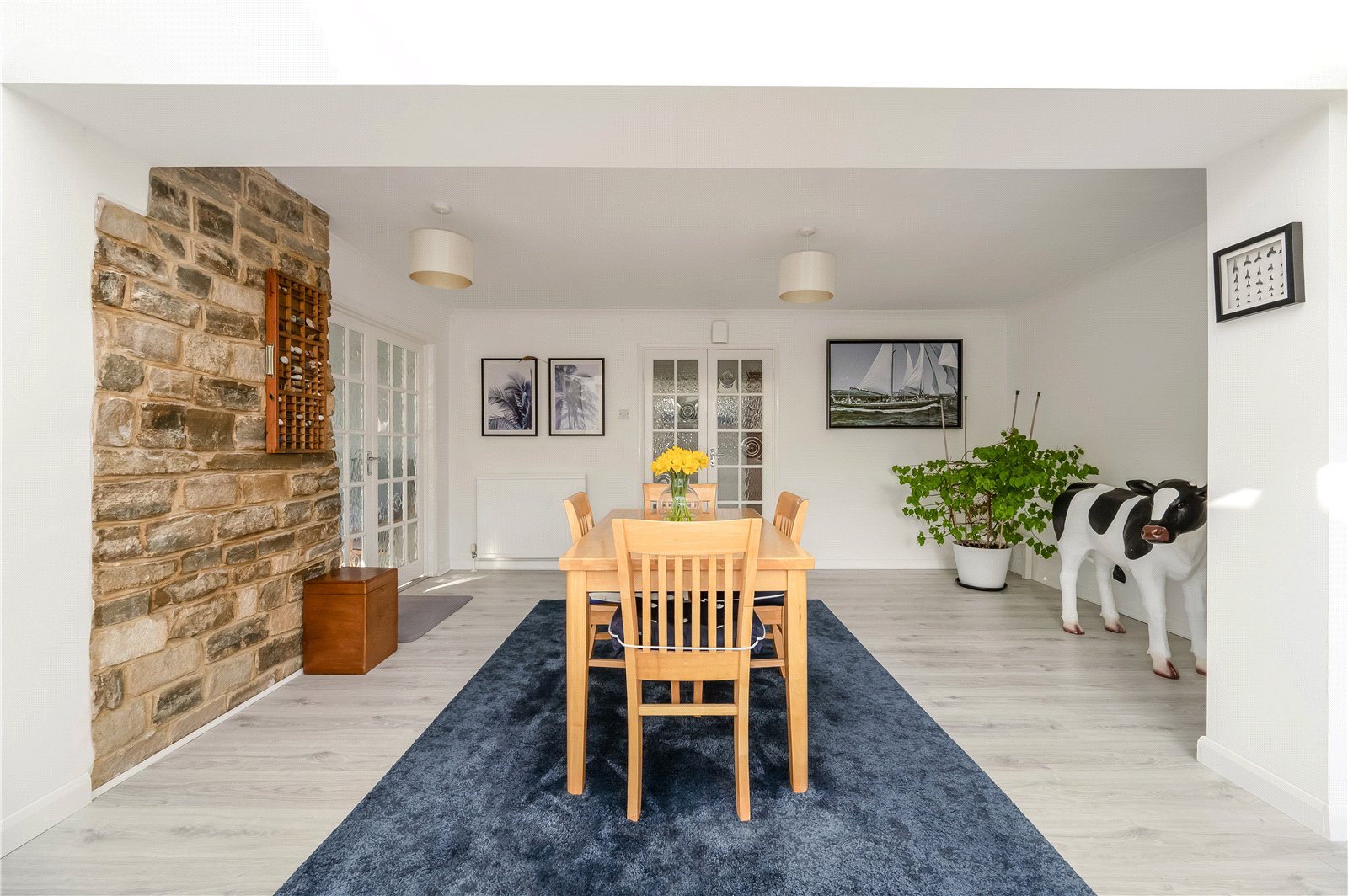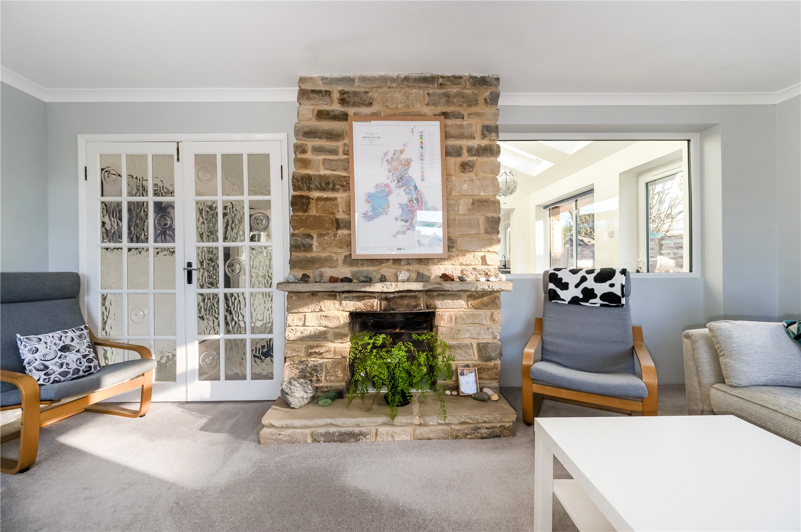 The bright and welcoming sitting room benefits from a dual aspect, allowing natural light to pour in. A striking stone fireplace provides an attractive focal point. Glazed internal doors open into a generous dining area, thoughtfully arranged open plan to the kitchen, forming an exceptional entertaining space. Twin roof lights illuminate the room, while a part-exposed stone wall introduces a distinctive feature. The kitchen is sleek and contemporary, fitted with a range of integral appliances and complemented by a separate utility room.