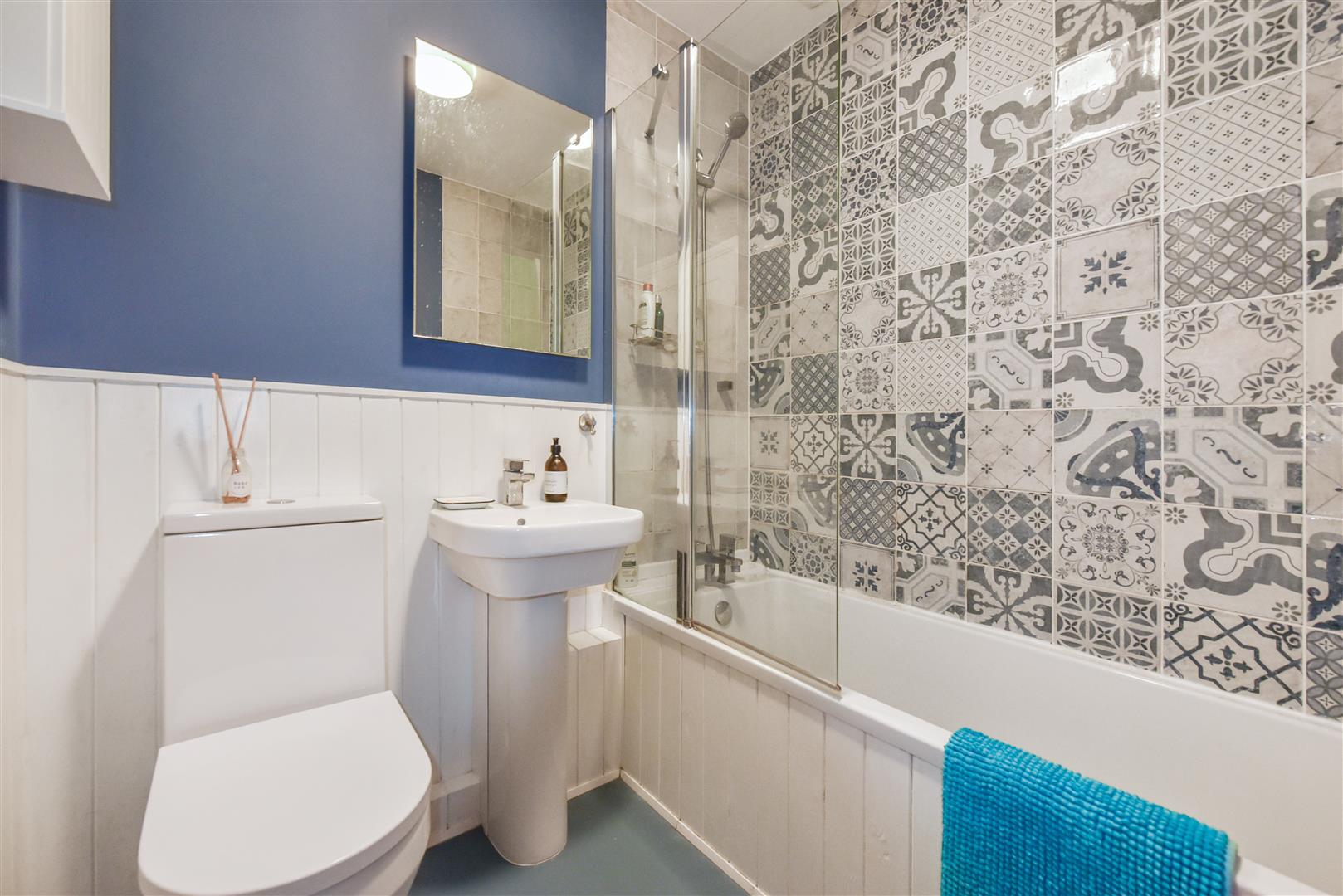 Family Bathroom 2: Tiled inset bath with shower over, chrome heated towel rail, wash basin, WC.
