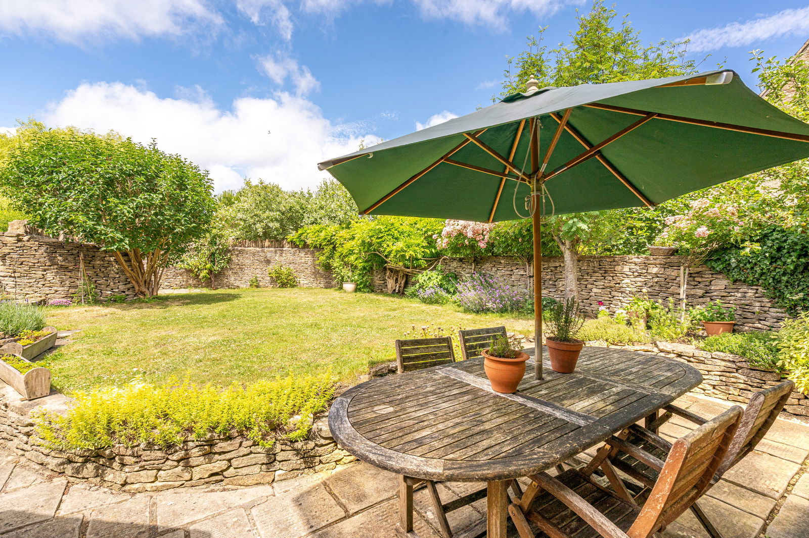 The cottage is set behind Cotswold stone walling and screened by well-established shrubs and trees. The westerly rear garden is laid mostly to lawn with a patio terrace and colourful borders of mixed perennials including a wisteria. There is plenty of on-street parking easily available in front of the cottage. Within the garden is a stone-built store complete with power connection.