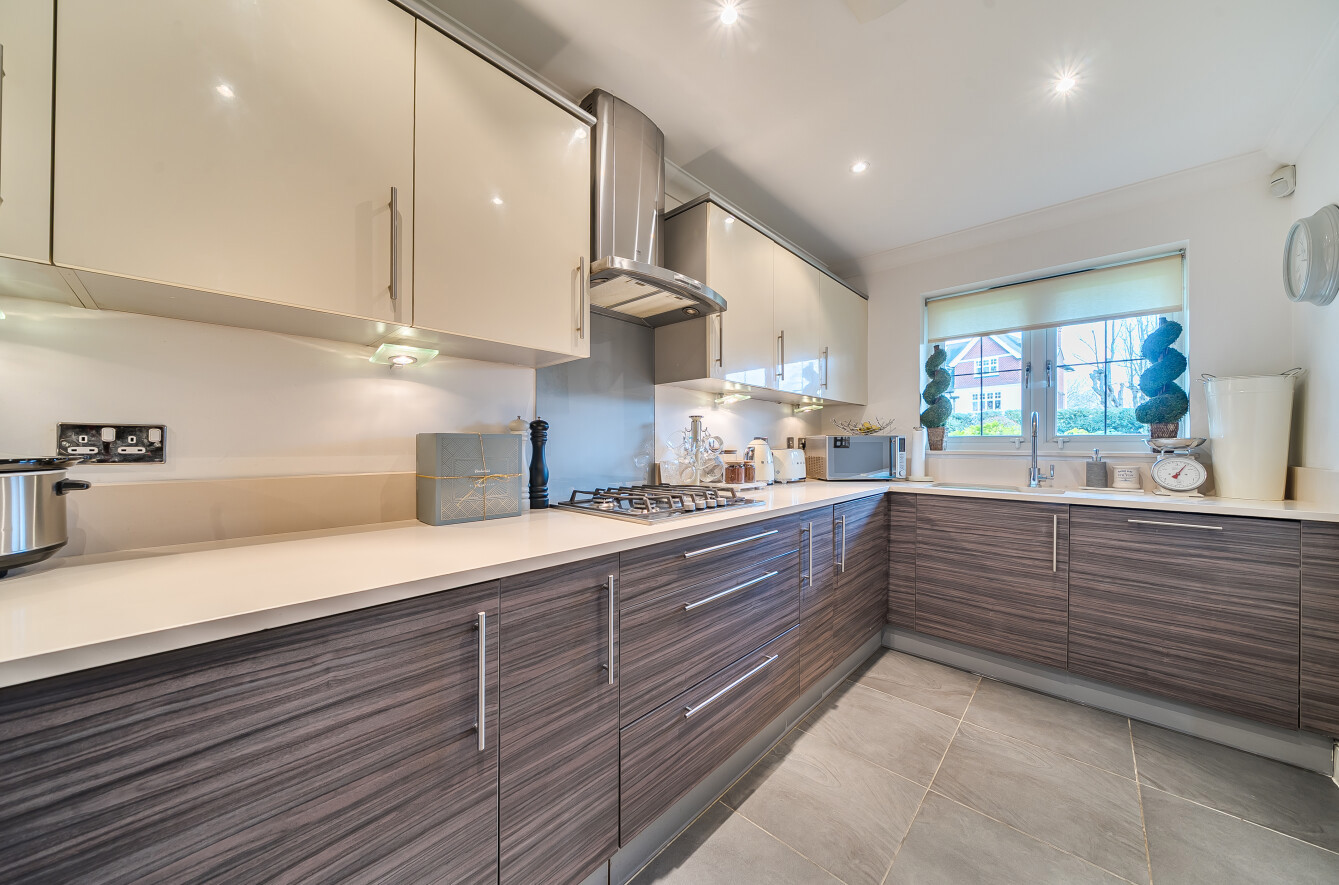 The impressive kitchen features a comprehensive range of sleek units, with added interest created by the contrasting finishes of the wall and floor cabinets. Appliances are integrated, and a quartz work surface provides a high-quality finish.