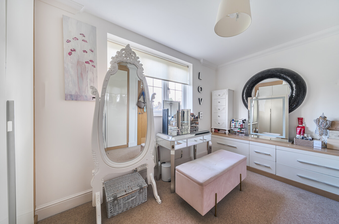 The first-floor features two of the bedrooms. The front bedroom incorporates extensive fitted wardrobes and drawers, while the rear bedroom benefits from a luxury en suite, also accessible from the landing. This features a bath with an overhead shower, a basin set into a fitted vanity unit with a large mirror above, and feature tiling for added interest.