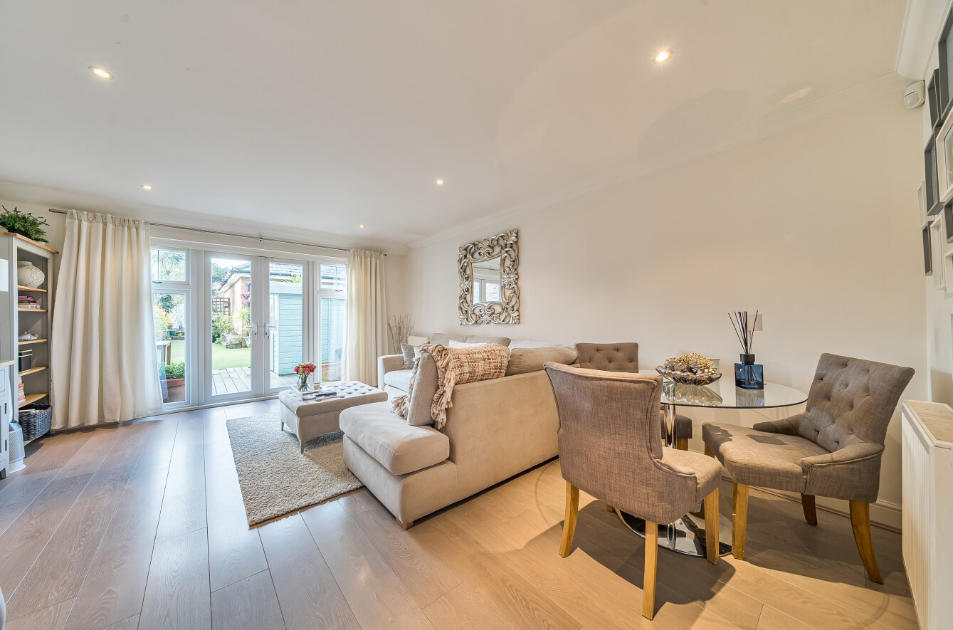 The large 247 sq ft reception room easily accommodates a full range of lounge and dining furniture. French doors open onto a decked patio and the rear garden.