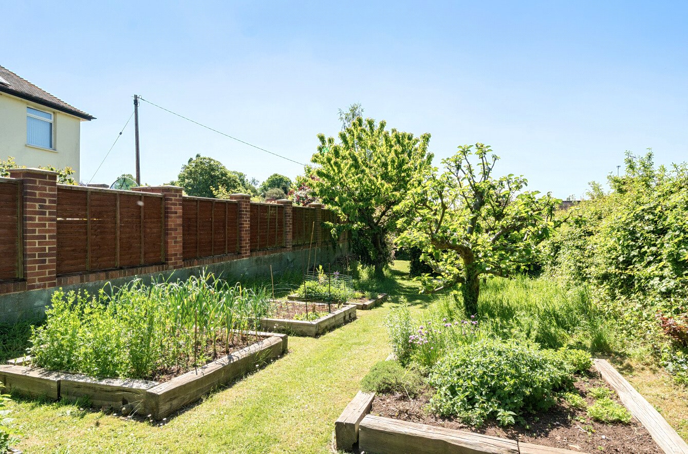 Further steps lead to an additional lawn and a large vegetable garden beyond, making this outdoor space perfect for gardening enthusiasts or outdoor activities.