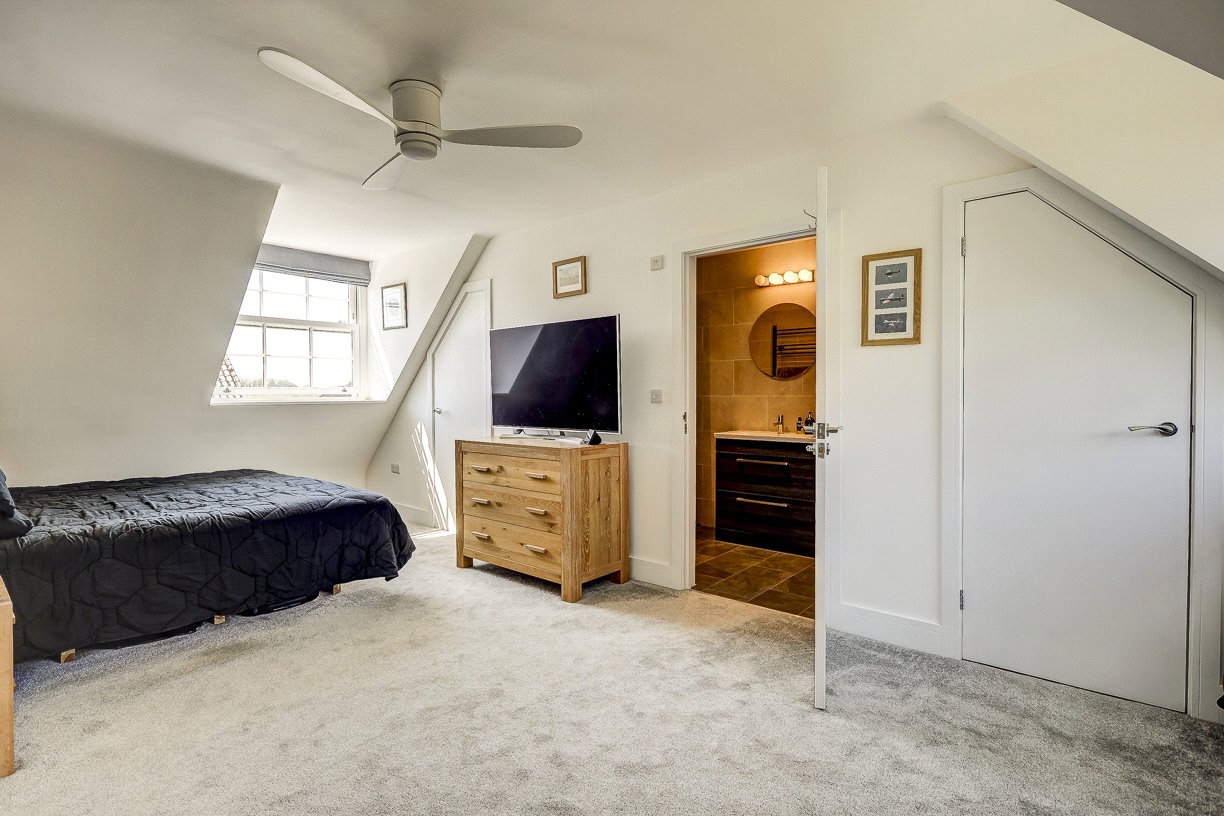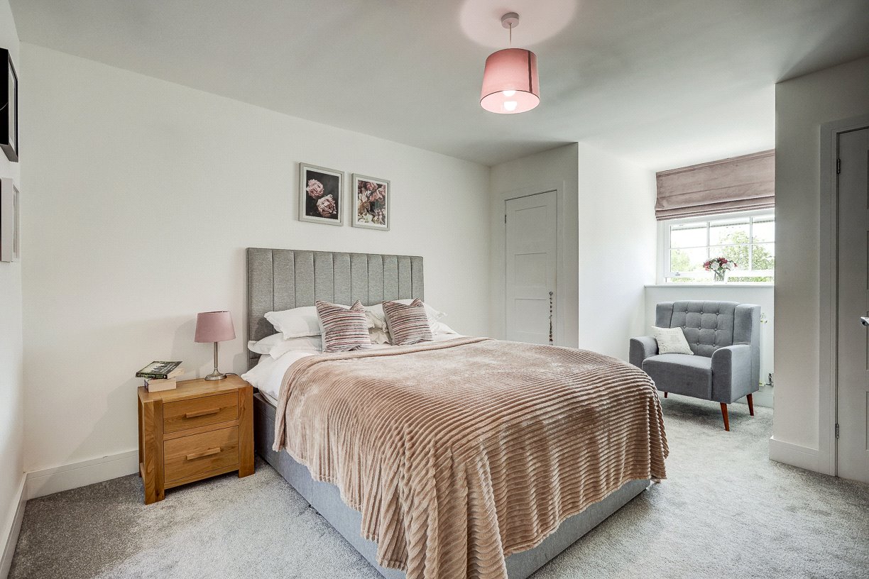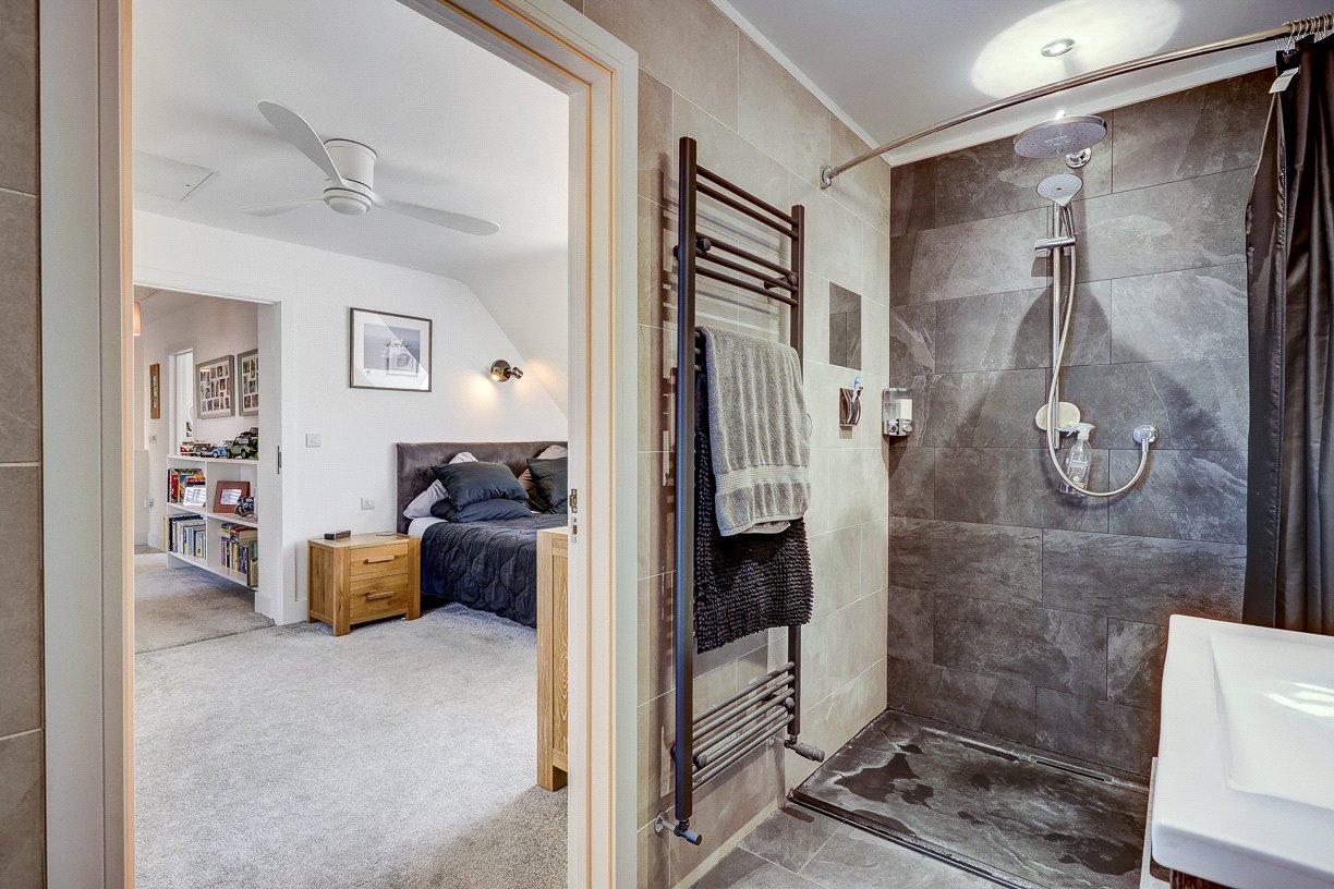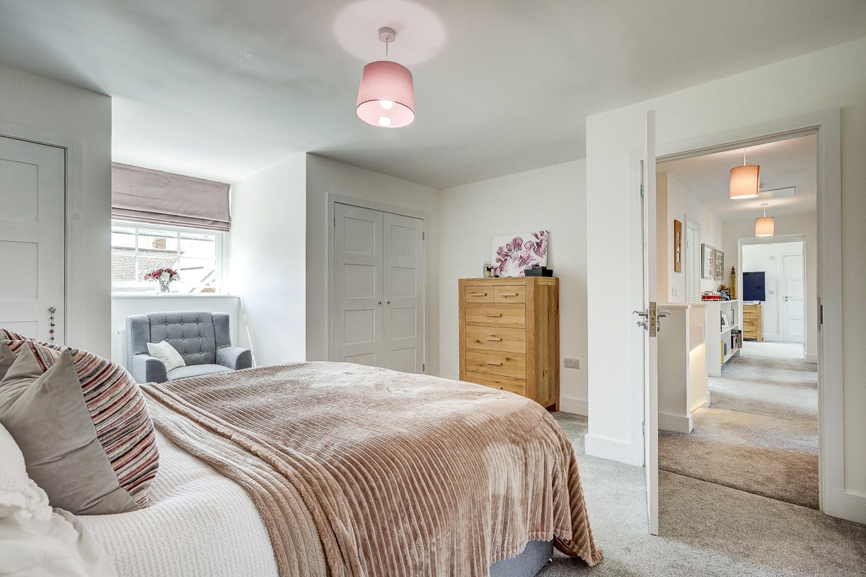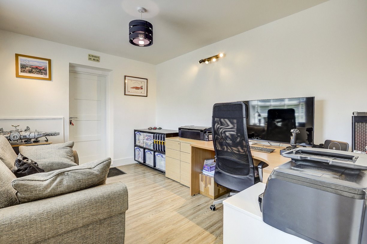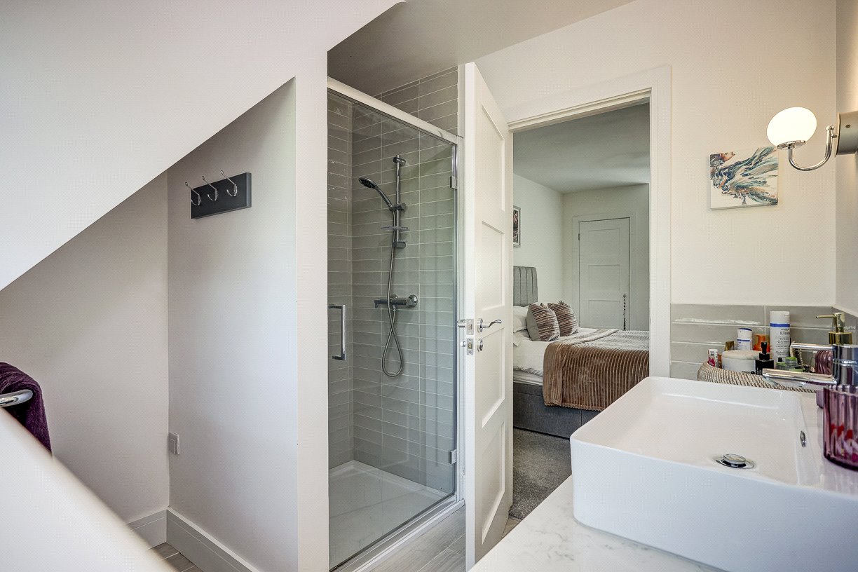 Upstairs, a feature-lit staircase leads to a spacious landing connecting four bedrooms and a family bathroom. The principal bedroom boasts fitted wardrobes, a pleasant rooftop view, and a high-spec en-suite shower room. A second large double bedroom also includes two fitted wardrobes and a stylish en-suite wet room. The third bedroom is a generous double with a built-in wardrobe, while the fourth is ideal as a guest room or additional home office. The family bathroom is equipped with both a bath and separate shower.