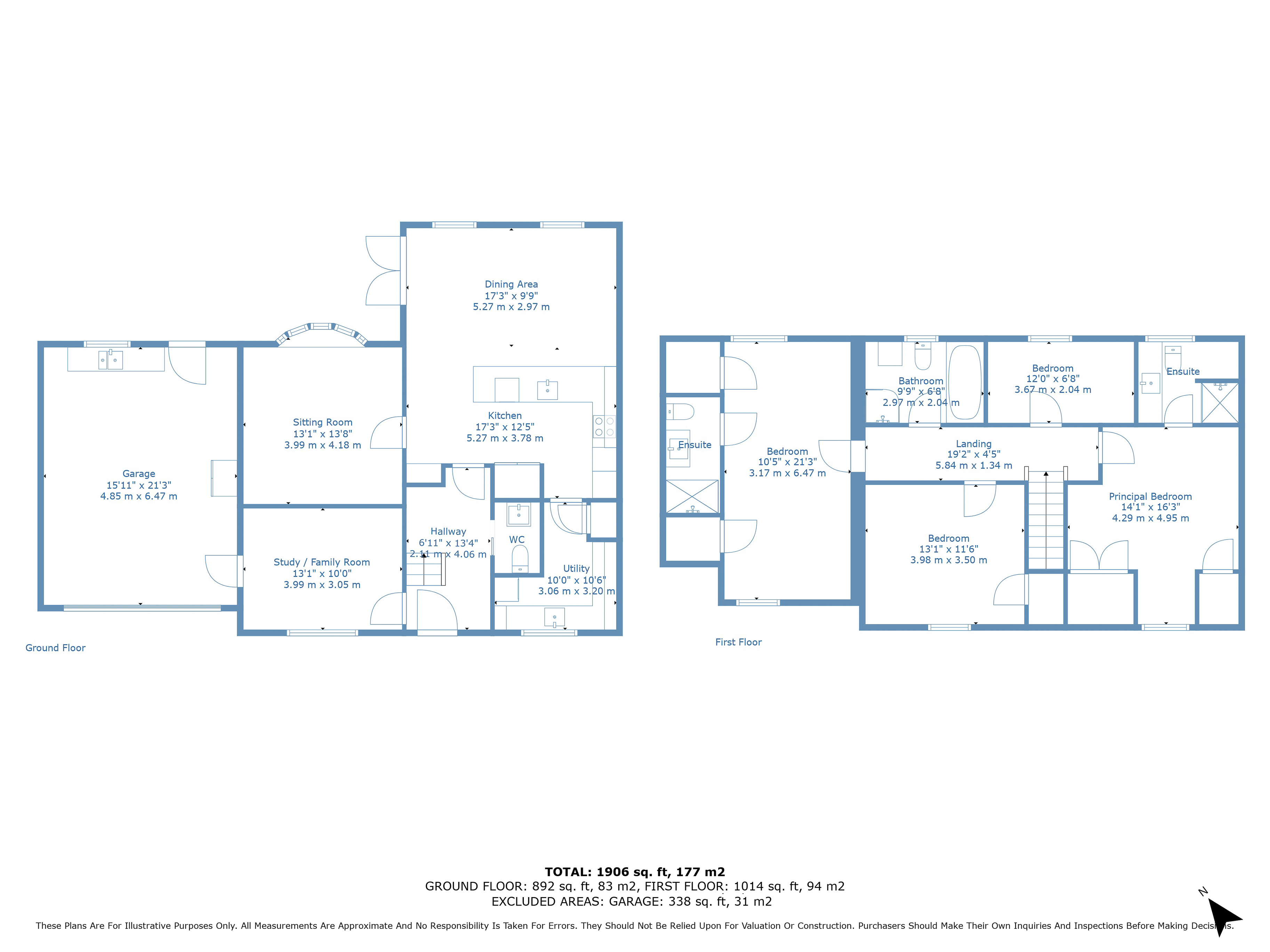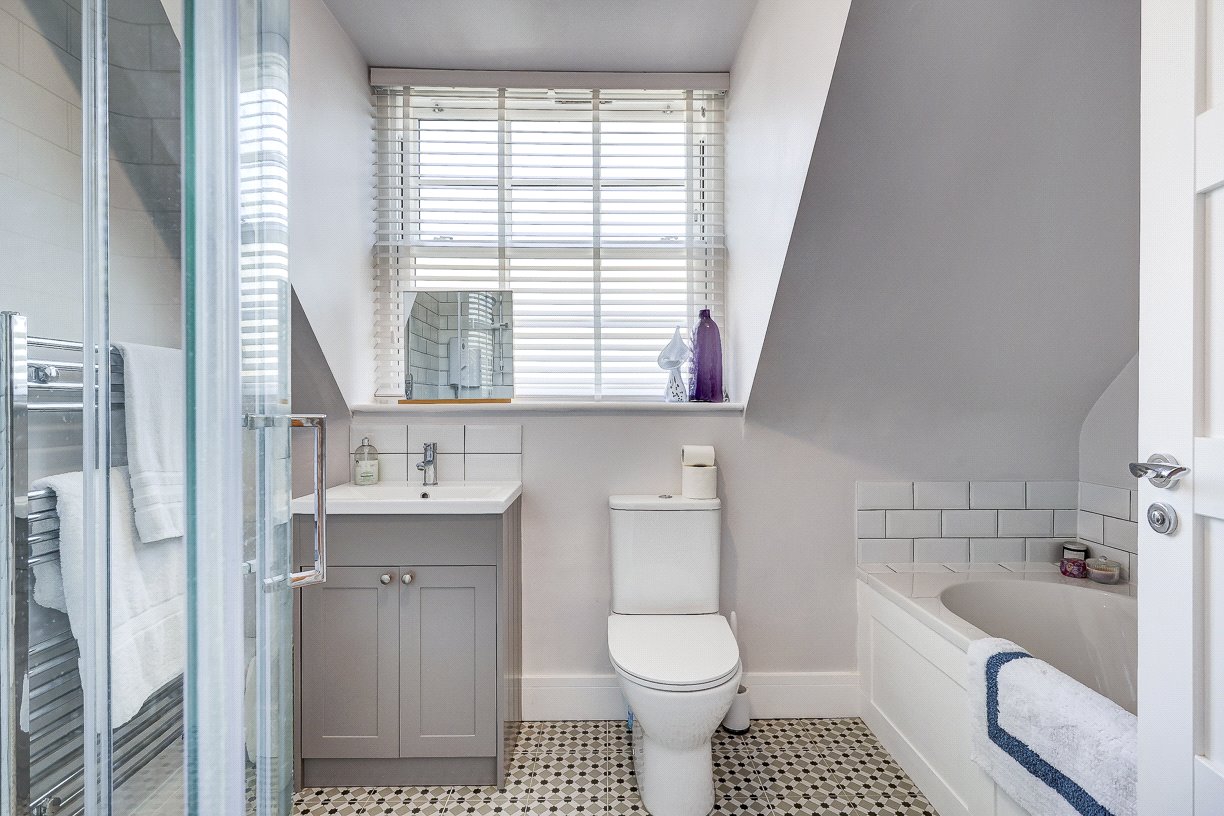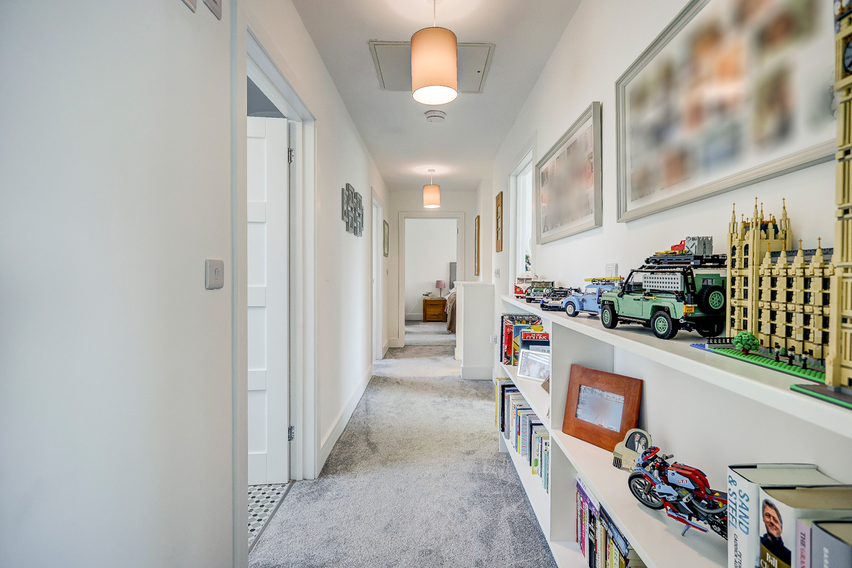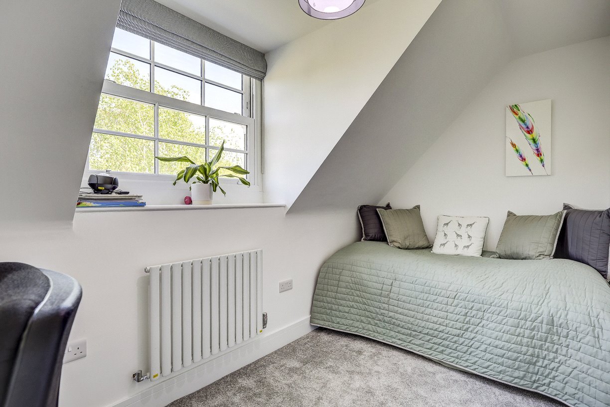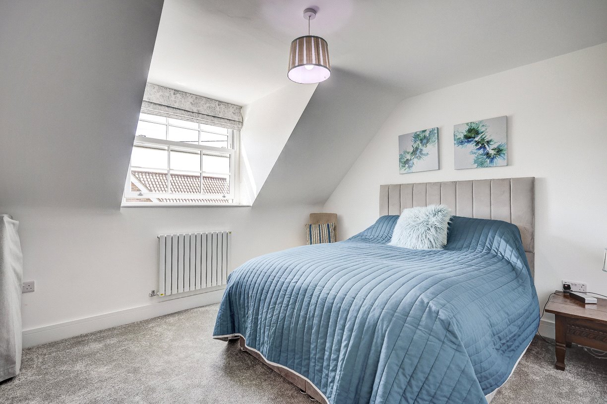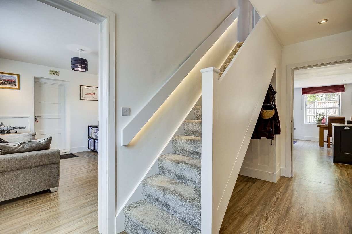 Upstairs, a feature-lit staircase leads to a spacious landing connecting four bedrooms and a family bathroom. The principal bedroom boasts fitted wardrobes, a pleasant rooftop view, and a high-spec en-suite shower room. A second large double bedroom also includes two fitted wardrobes and a stylish en-suite wet room. The third bedroom is a generous double with a built-in wardrobe, while the fourth is ideal as a guest room or additional home office. The family bathroom is equipped with both a bath and separate shower.
