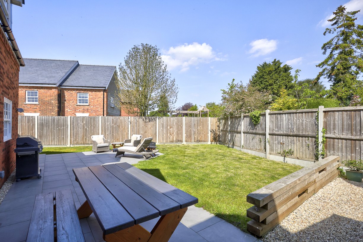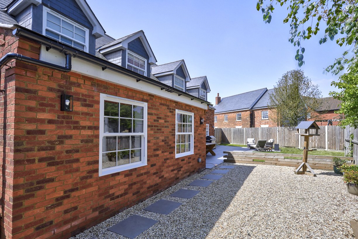 The enclosed rear garden offers a peaceful retreat, featuring a sunny shingled area, a sweeping patio, and a well-kept lawn bordered by fencing and hedging.