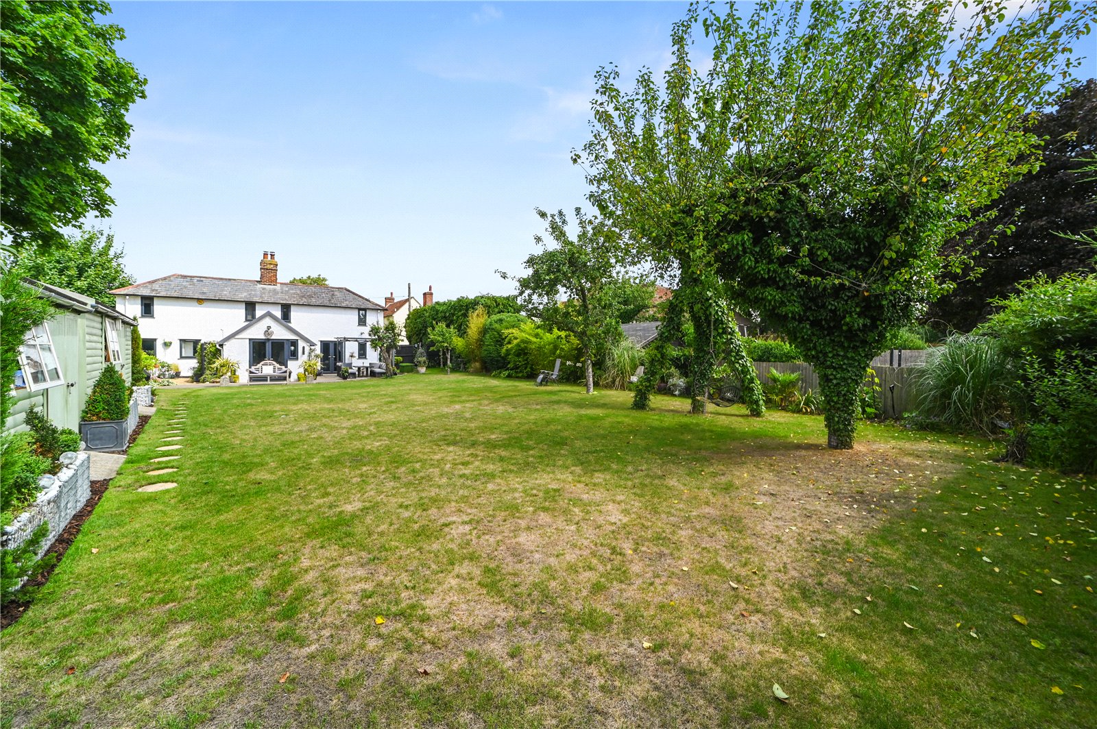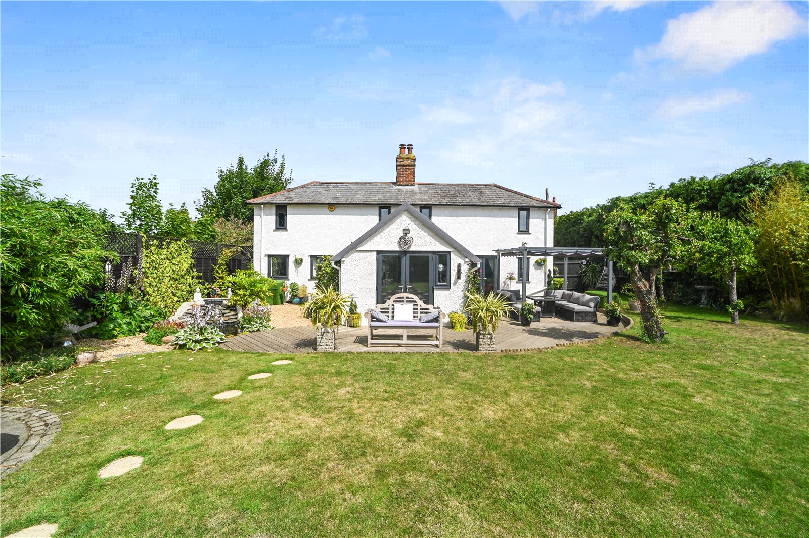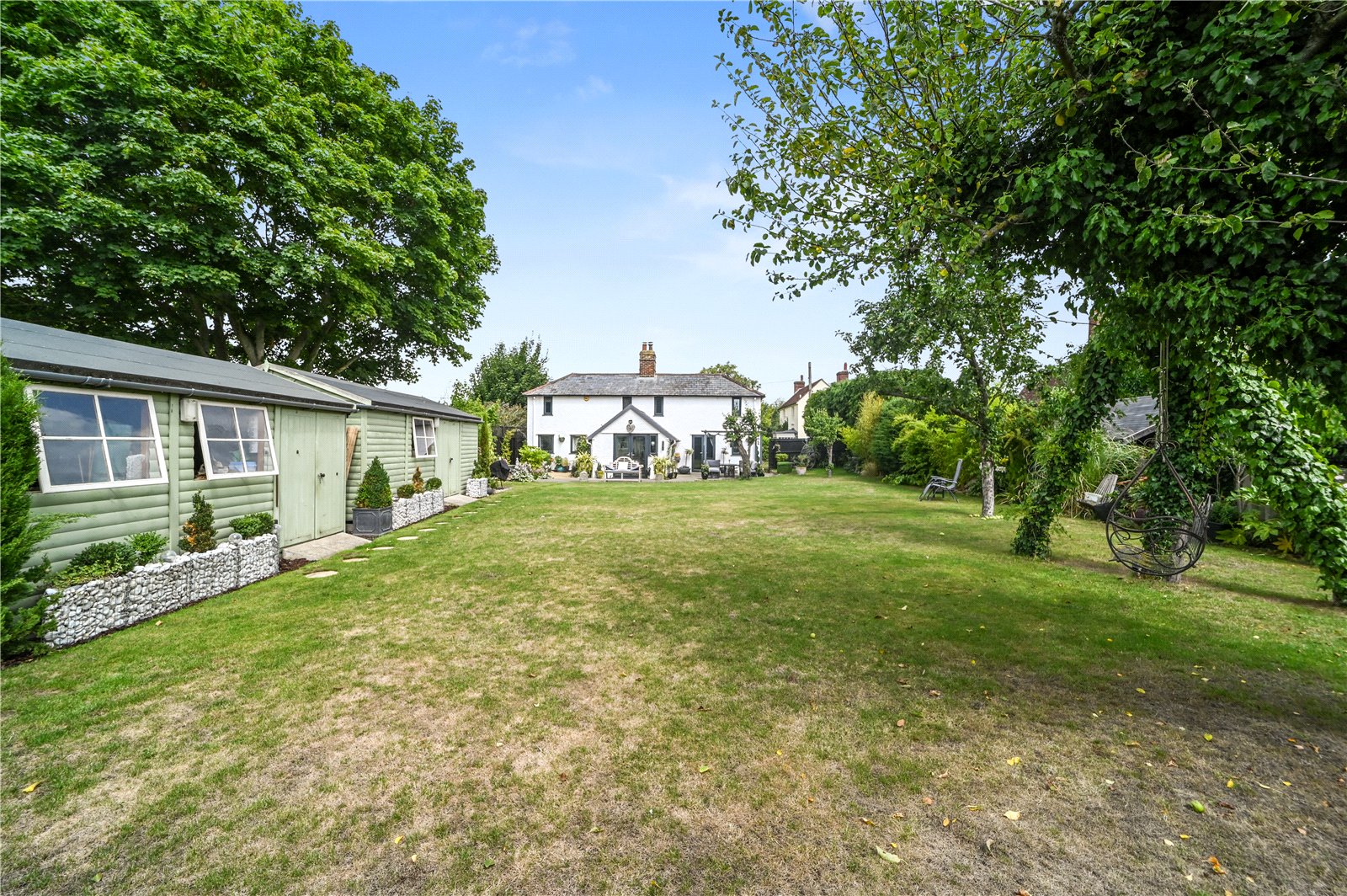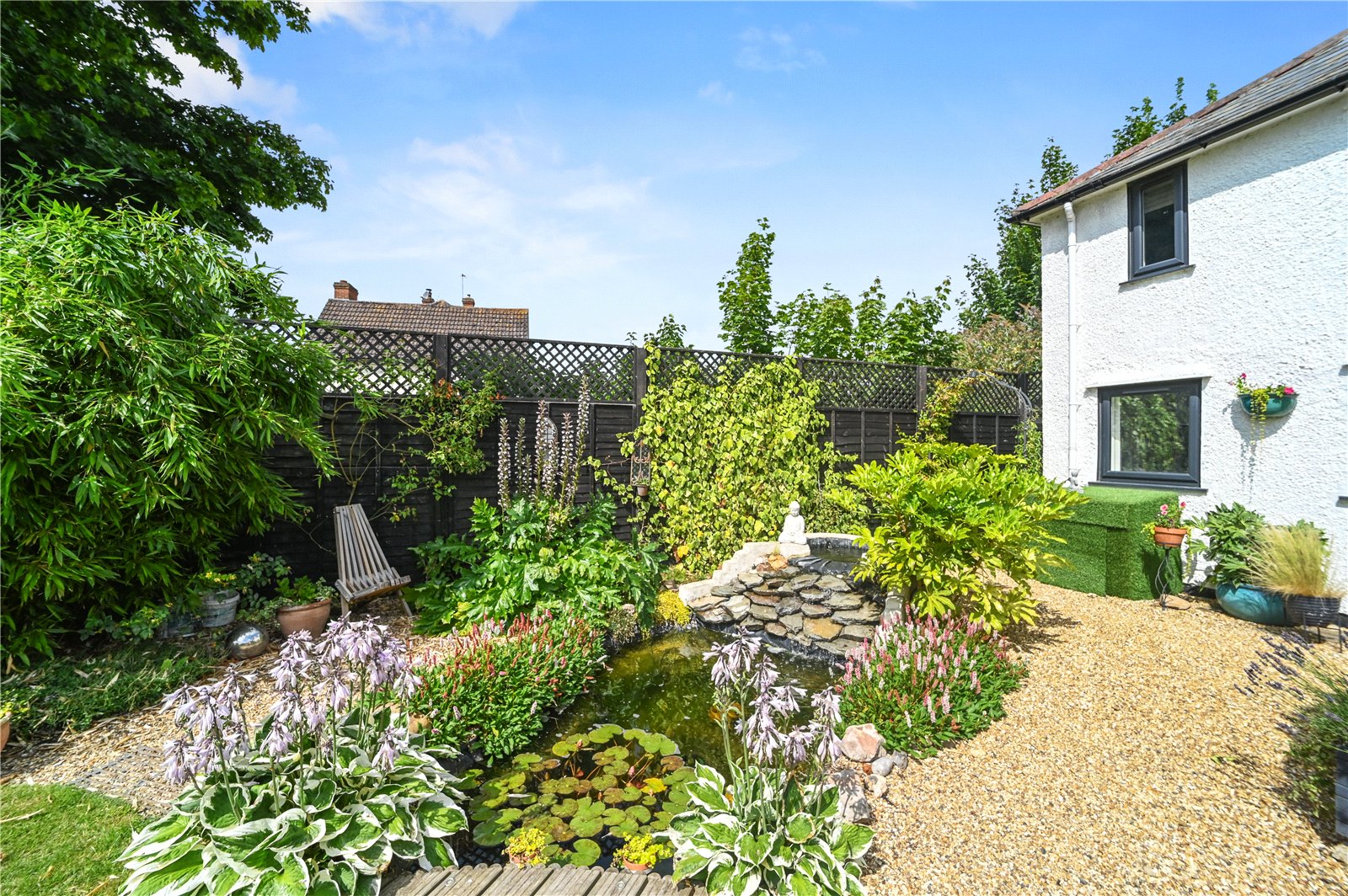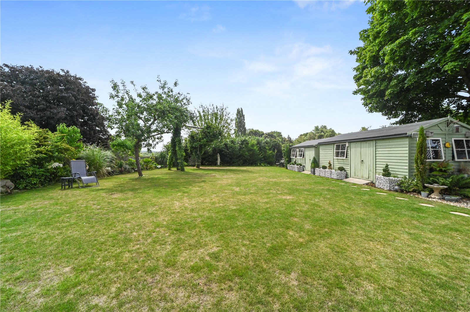 The property is approached via a gravel driveway providing ample off-road parking, framed by mature hedging for a sense of privacy and seclusion. To the rear, a beautifully maintained south-facing garden offers a generous expanse of lawn bordered by mature trees, established planting and thoughtfully designed seating areas. A raised deck, directly accessed from the house, provides an ideal space for outdoor dining and relaxation. The garden also features a tranquil pond surrounded by colourful beds, offering a peaceful retreat. To one side, two large timber workshops offer excellent storage or potential for hobby use, blending neatly into the green surroundings. The garden benefits from open views beyond the rear boundary, enhancing the sense of space and rural charm that defines this unique home.