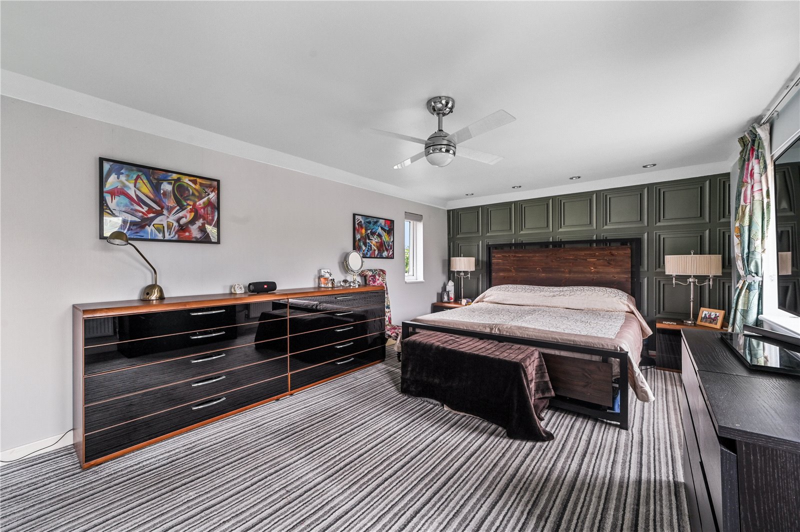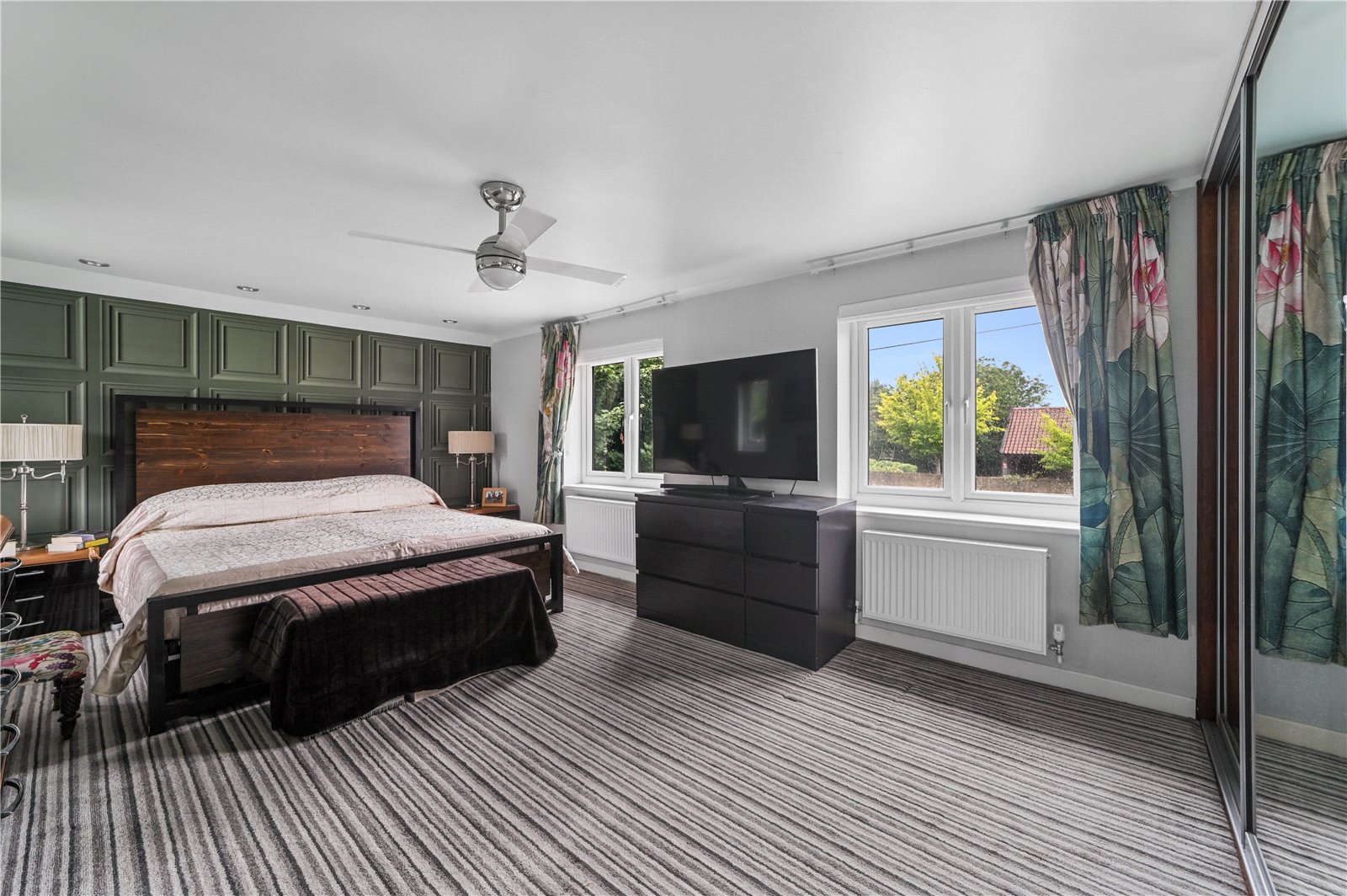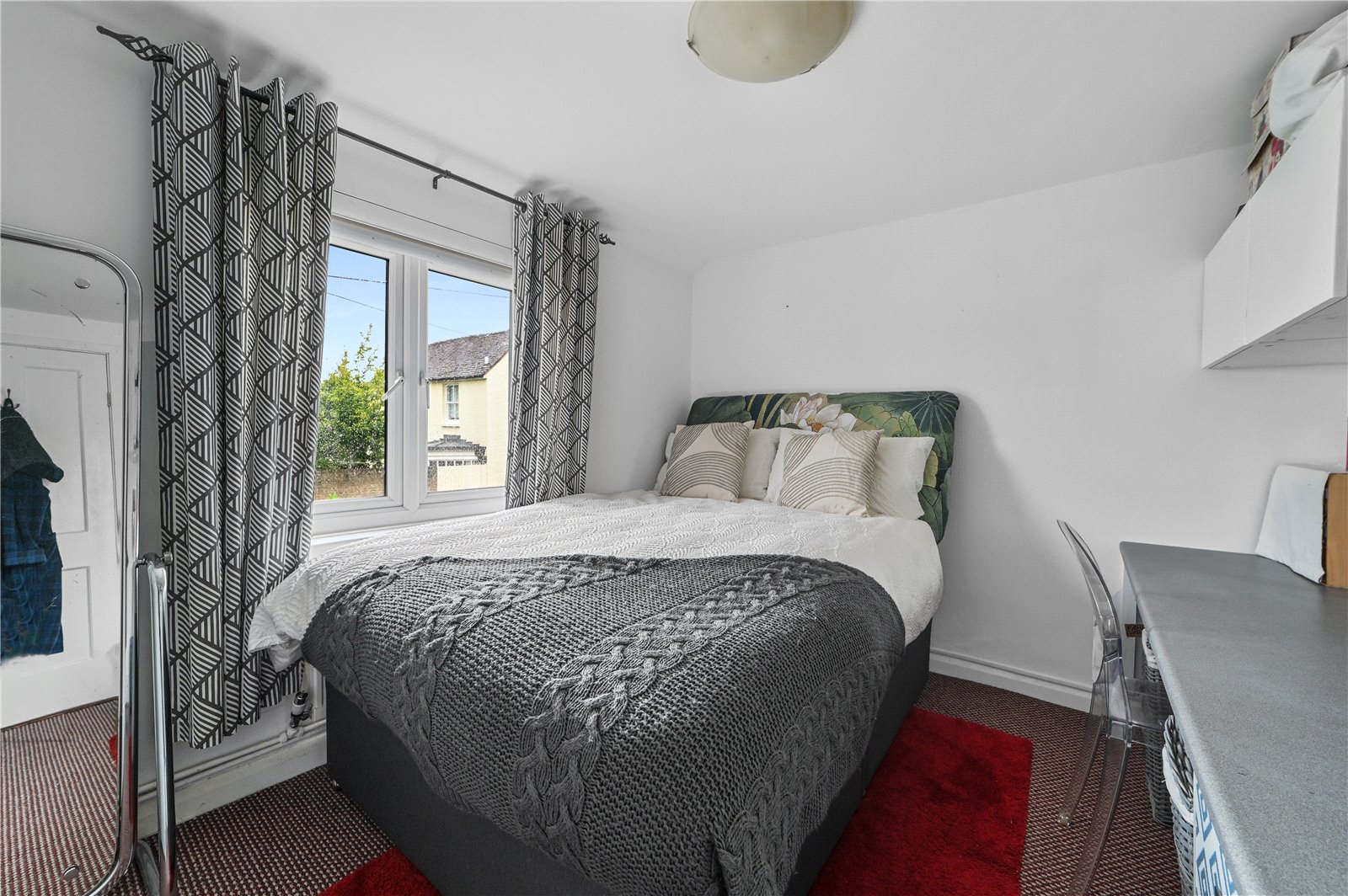The first floor comprises two double bedrooms and a well-appointed family bathroom. The principal bedroom enjoys generous proportions and a bright dual-aspect outlook, creating a sense of space and calm. A feature wall and built-in storage provide practical elegance, while multiple windows enhance natural light throughout the day. The second bedroom is also a comfortable double, ideal for guests or family use.