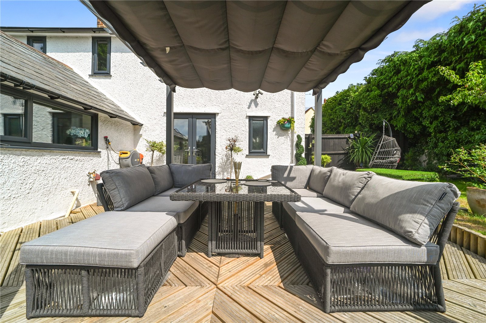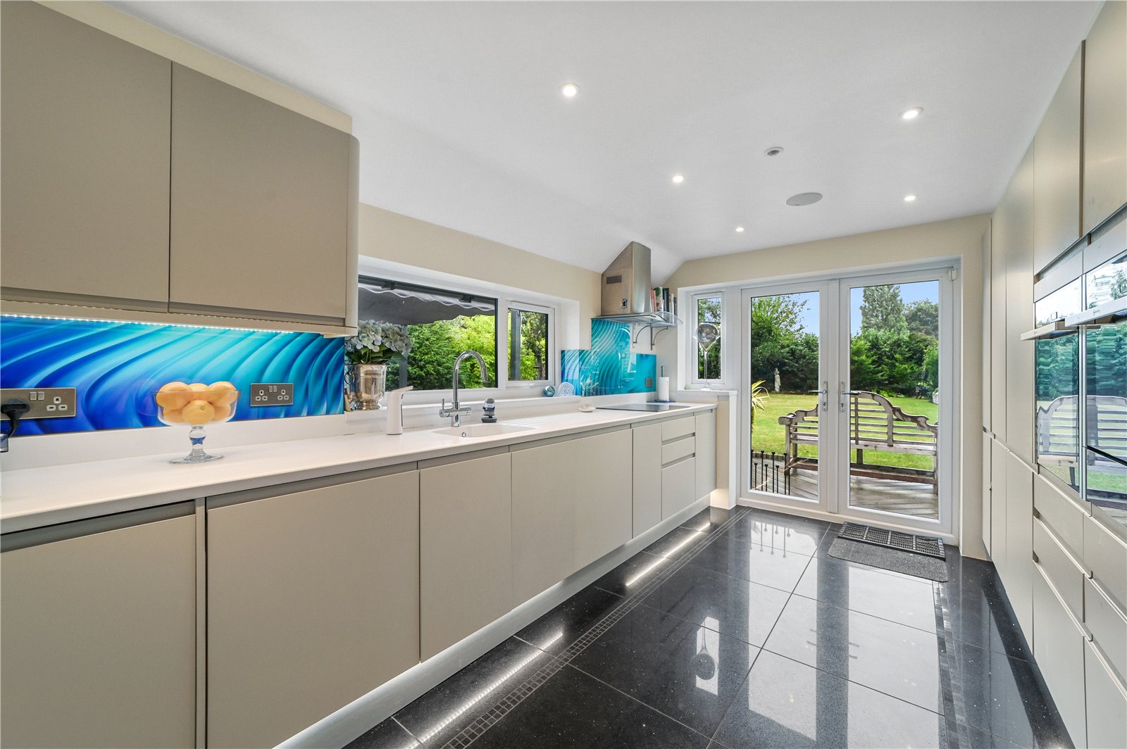 The kitchen is positioned at the rear and presents a striking contrast in style with sleek, contemporary cabinetry and integrated appliances providing both form and function. Exceptionally well appointed, it offers a seamless blend of modern design and practical utility, ideal for everyday living and entertaining alike. Dual-aspect windows and glazed doors maximise light while offering an uninterrupted outlook over the south-facing garden.