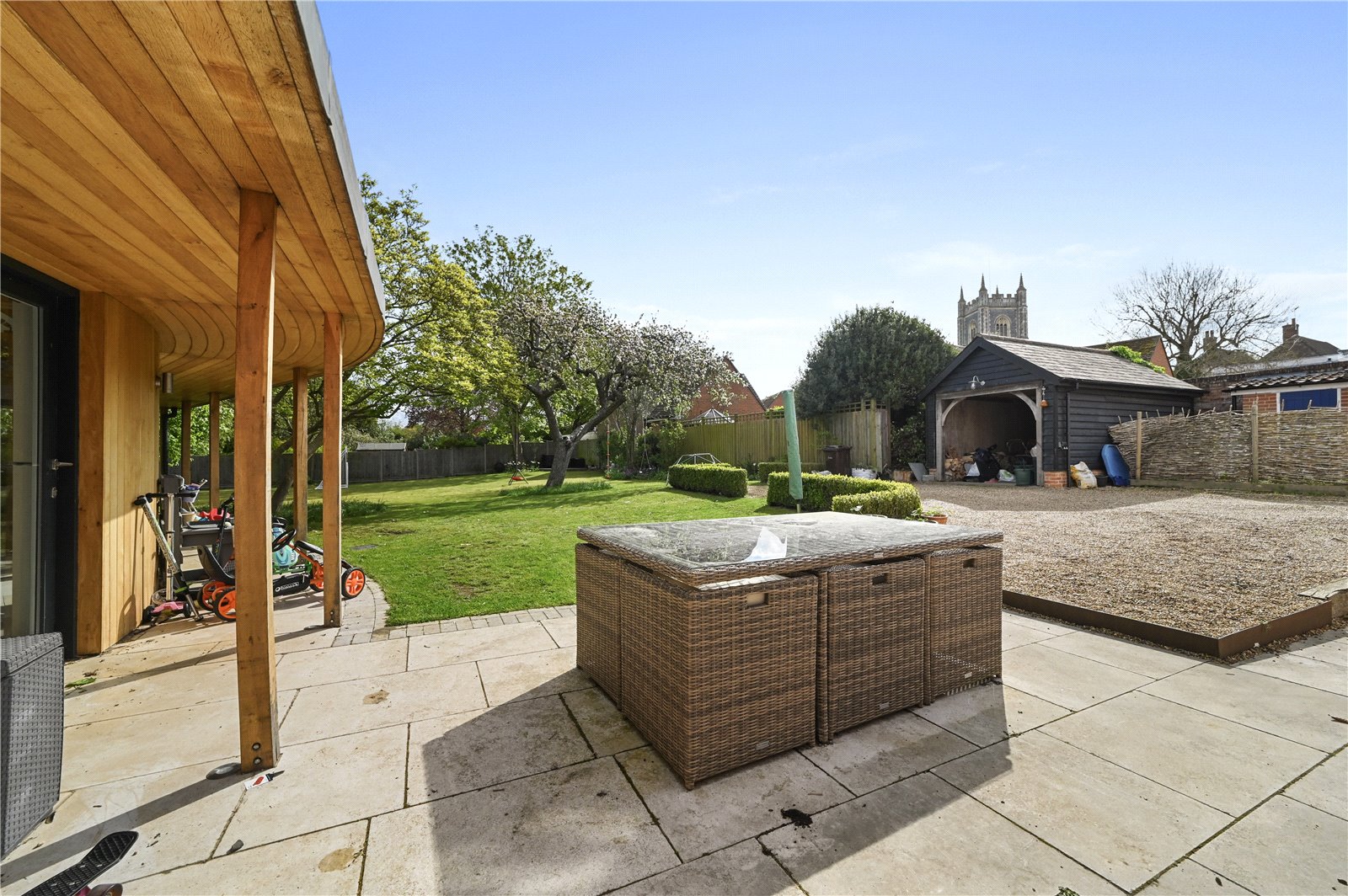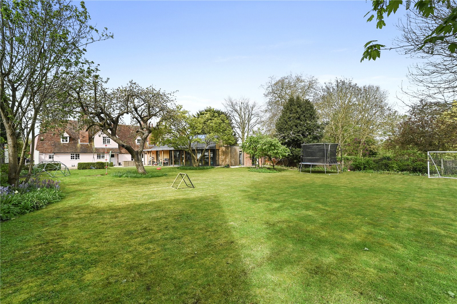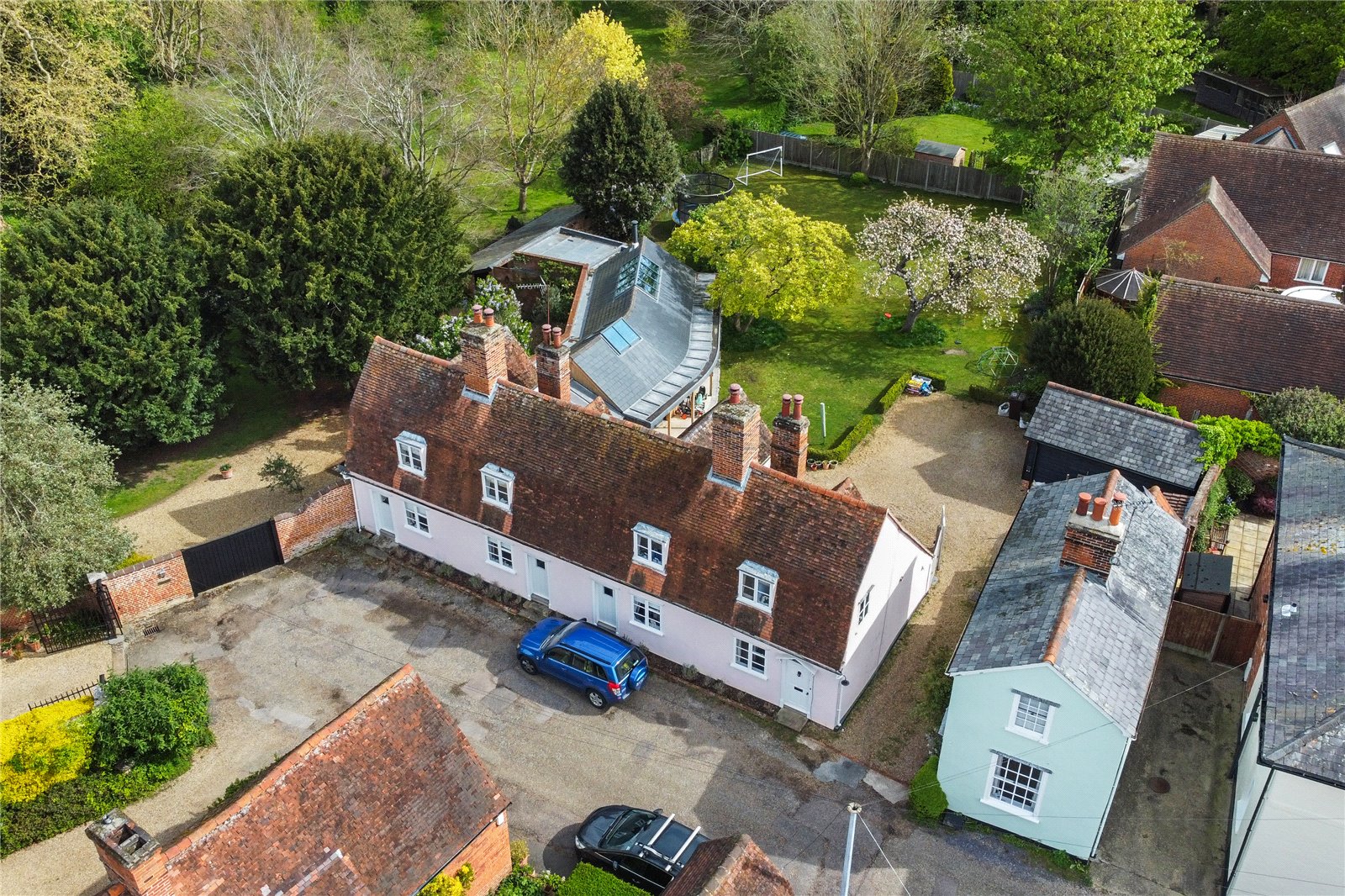 Commanding an outstanding position in the very heart of Dedham, this Grade II listed property masterfully combines historical elegance with contemporary design, creating a captivating family residence. Set on a quarter acre plot (STS), this family home features a striking modern extension that enhances its original centuries-old architecture, perfectly blending traditional charm with modern-day amenities. Upon entering, the property reveals a welcoming entrance hall that leads to a series of well-proportioned reception rooms, with windows strategically placed to maximize both views and light.