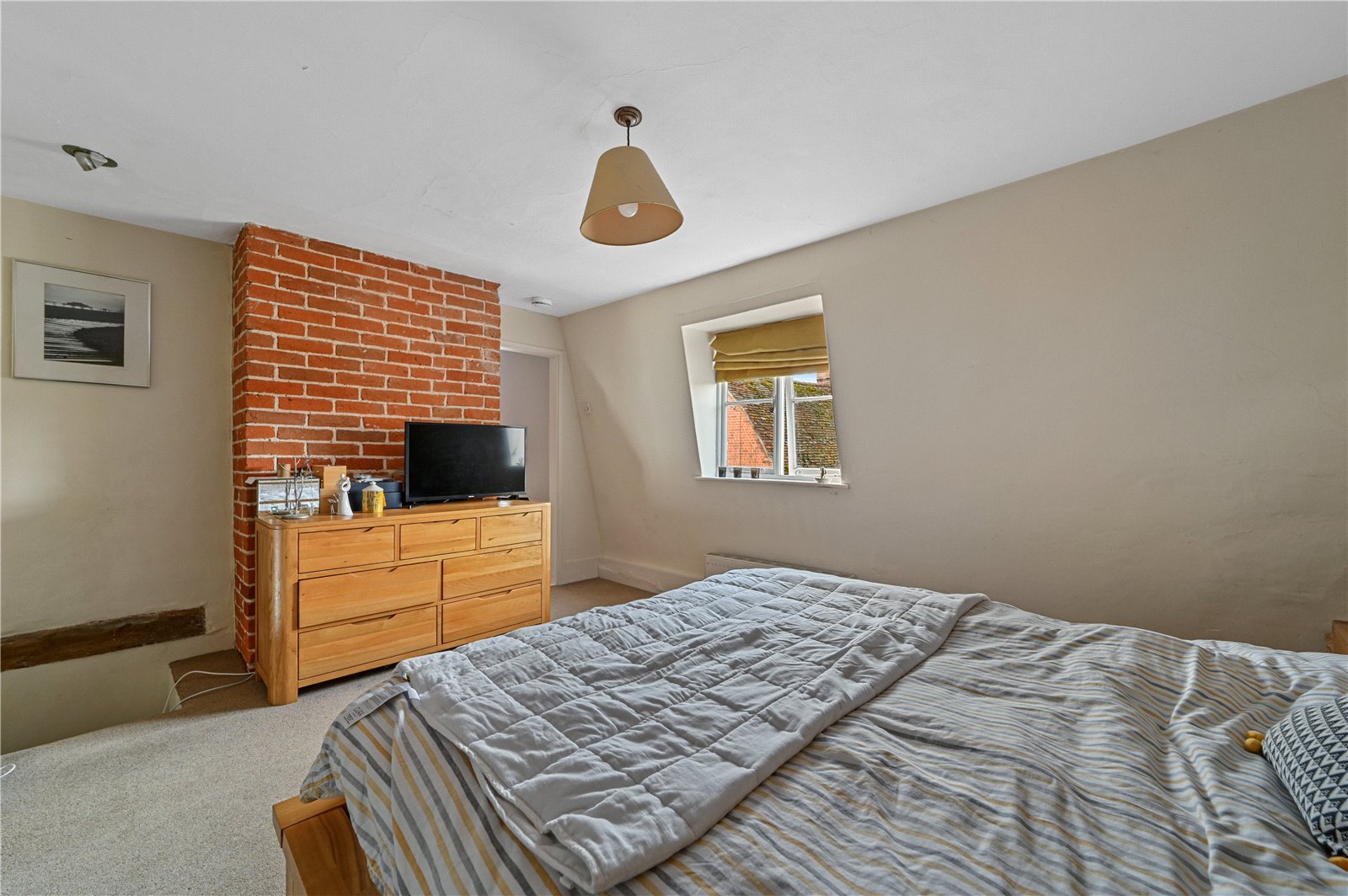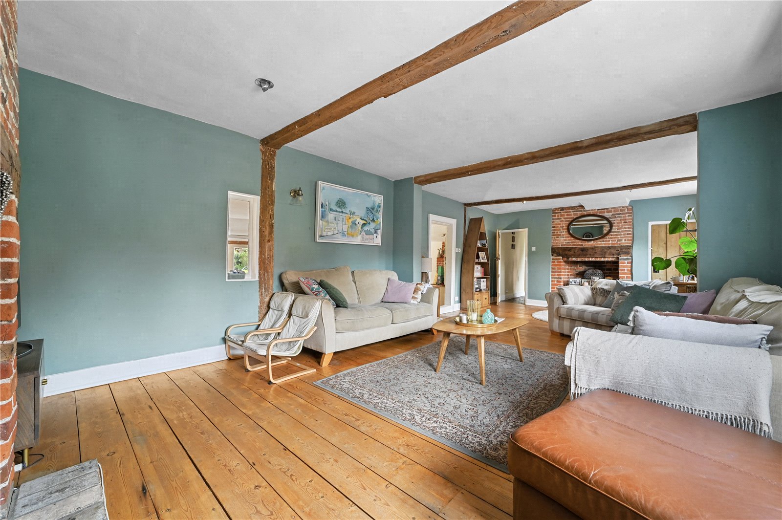 The sitting room, characterized by its exposed wooden timbers and brick fireplaces, offers a tranquil retreat. Additionally, for those who enjoy formal dining, a dedicated dining room, replete with further exposed brickwork and timbers, offers space to enjoy the company of family and friends.