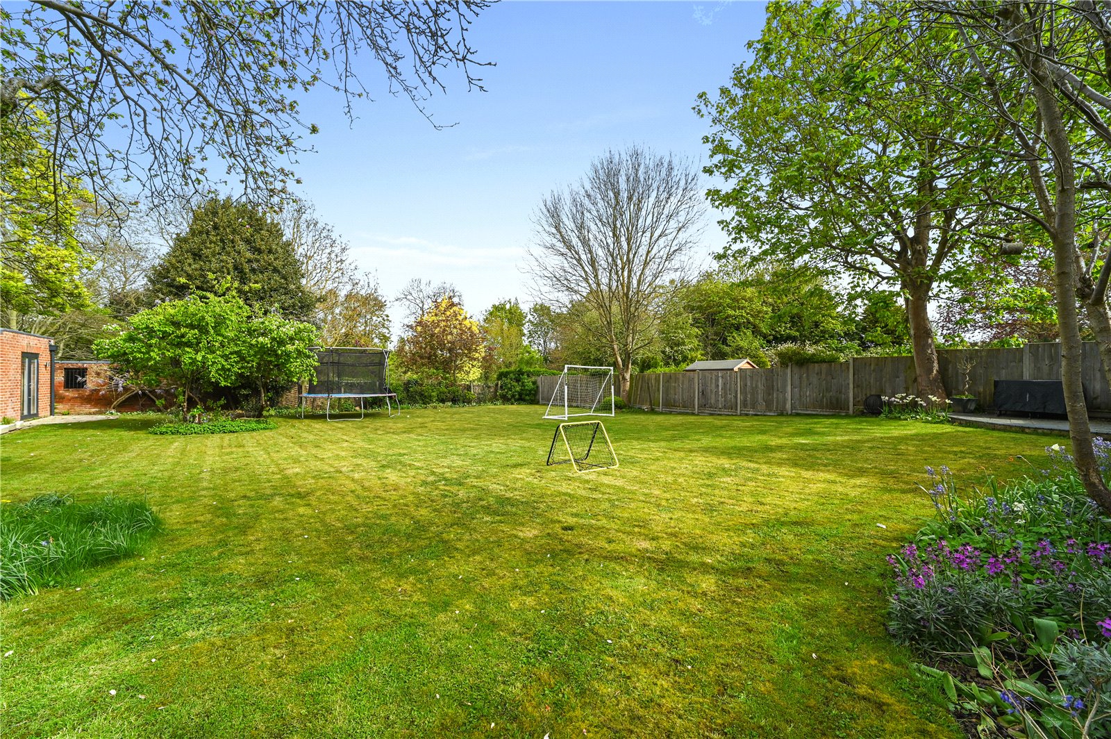 The exterior space of this property is spread across a generous plot, with the garden serving as a private retreat that complements the architectural heritage and modern additions of the home, featuring lush lawns bordered by mature trees that provide both privacy and a serene natural environment. The garden is thoughtfully designed to accommodate both relaxation and recreation, making it an ideal space for family activities and quiet contemplation. A charming path meanders through the garden, leading to various focal points including a secluded seating area ideal for outdoor dining or simply enjoying the peaceful surroundings.