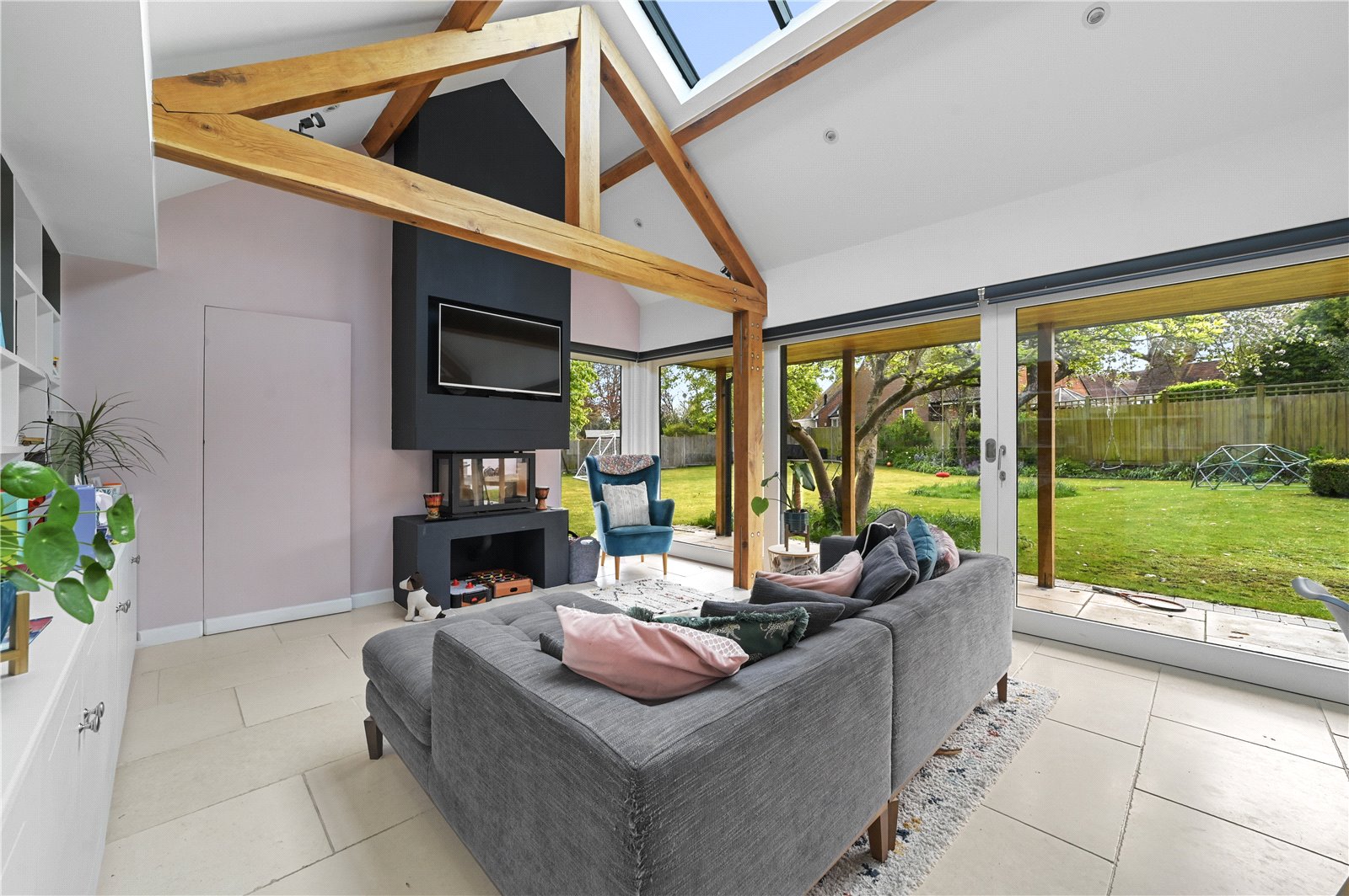 The ground floor also accommodates further living spaces that provide practical solutions for everyday living, including a playroom, study and garden room.