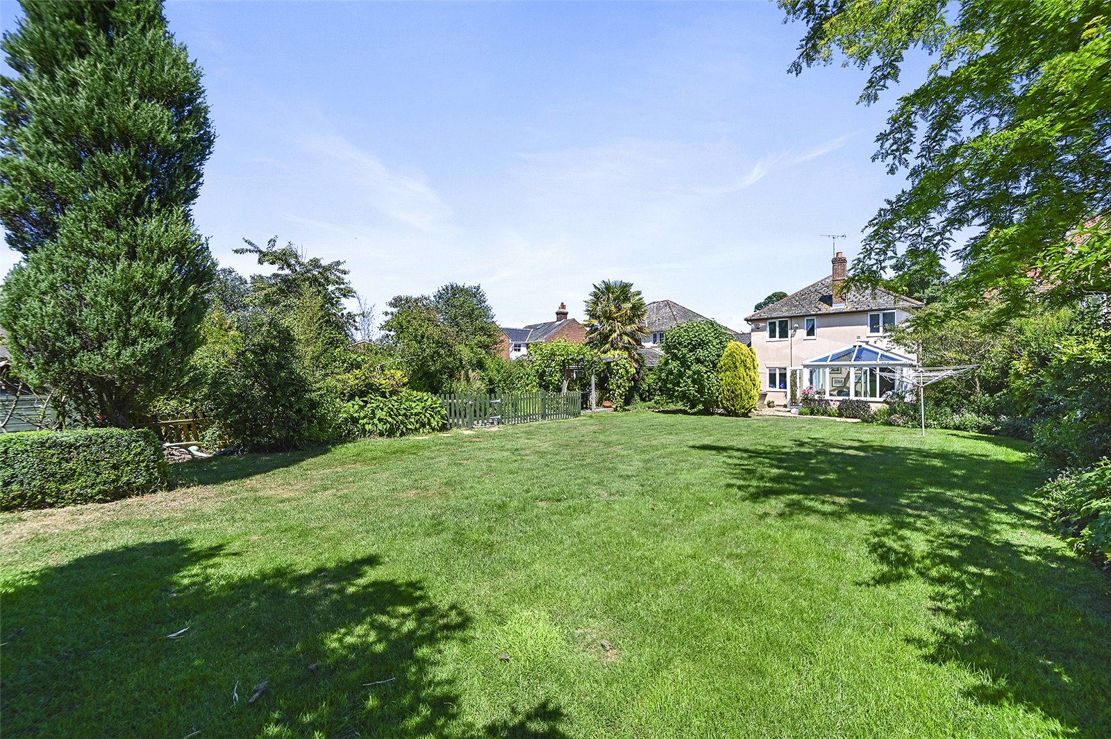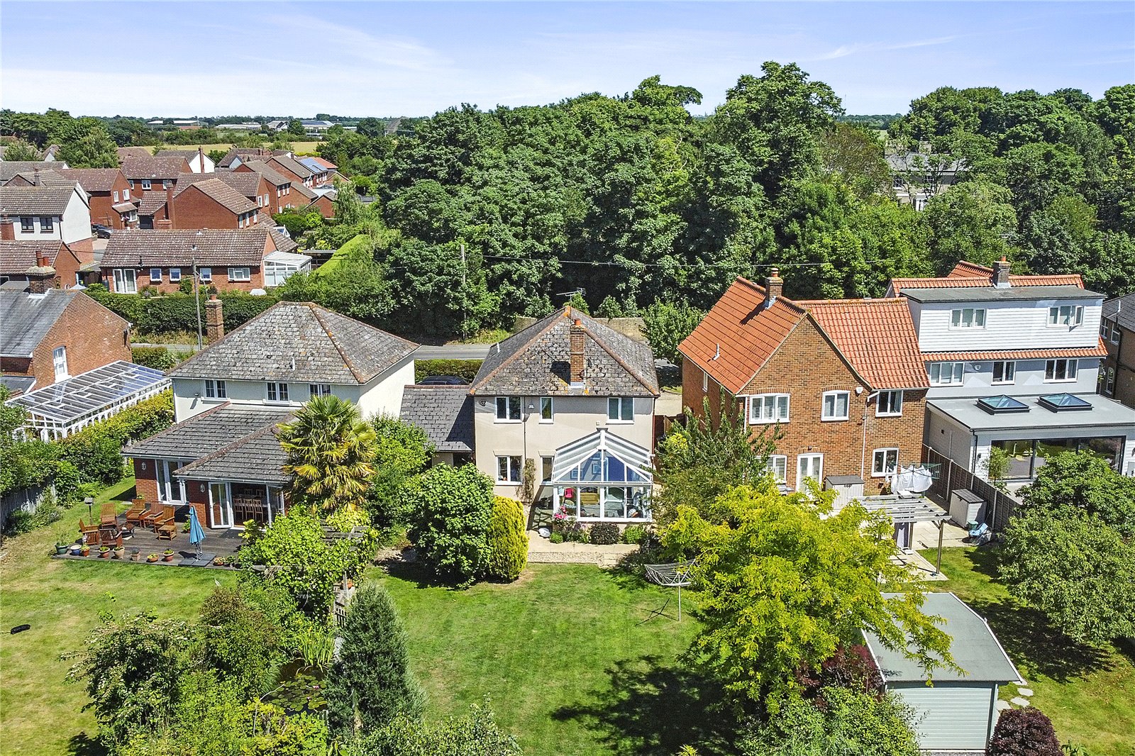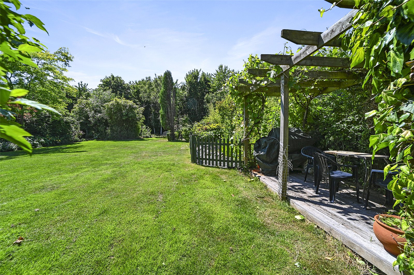 The remainder of the garden benefits from mature shrubs and trees, decking - with shady pergola over -, and an enclosed ornamental pond.