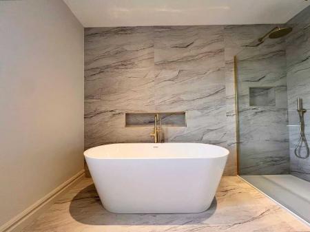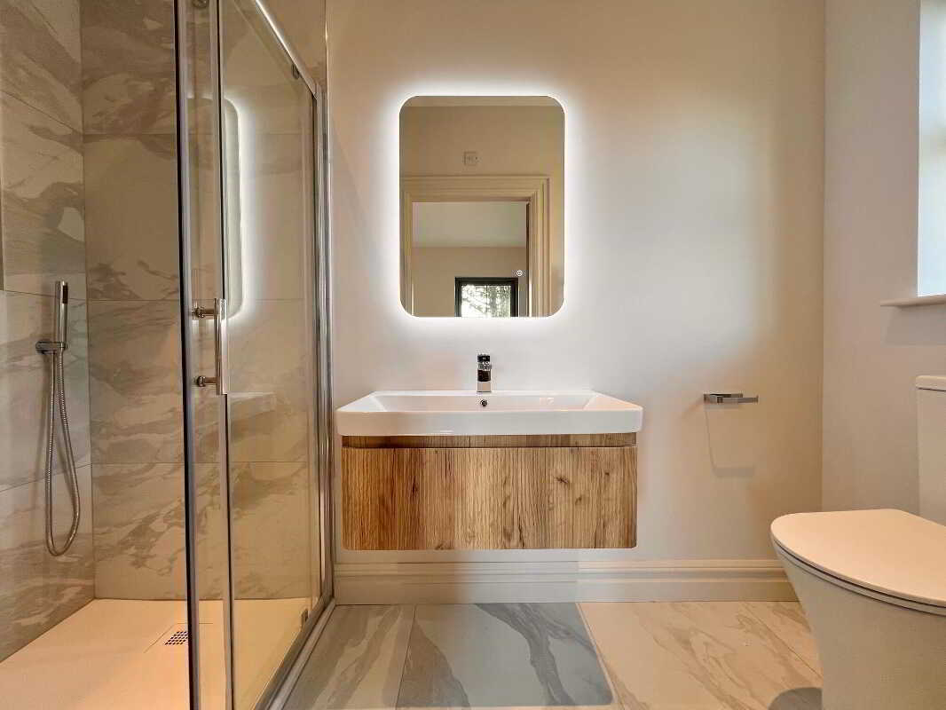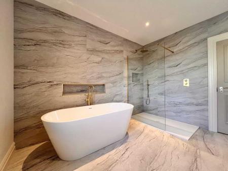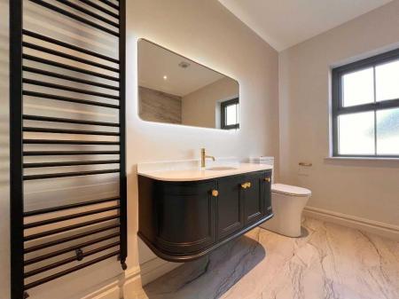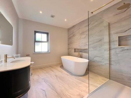 Ensuite with contemporary three piece white suite comprising of with wc, wall hung whb and vanity unit, illuminated mirror, power shower, recessed lights, floor fully tiled.Bedroom 2With laminate wood floor.Bedroom 3With laminate wood floor.Bedroom 4With laminate wood floor.Family BathroomContemporary four piece white suite comprising of wc, wall hung whb and vanity unit, illuminated mirror, freestanding bath, power shower with rainfall shower head, towel rail, recessed lights, walls part tiled, floor fully tiled.ExternalSpacious gardens to the front side and rear to be sown out in Spring.