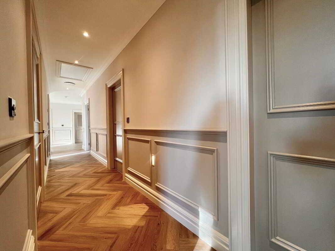 Solid wood two panel internal doors with detailed joinery to include hockey stick and deep skirting.