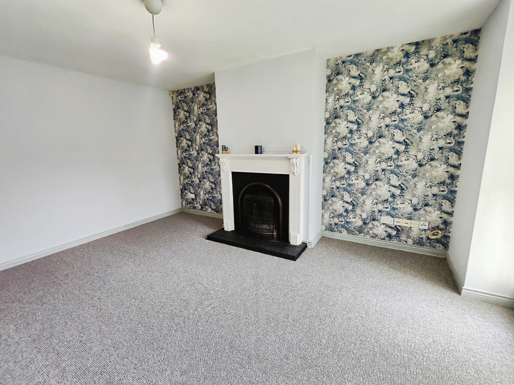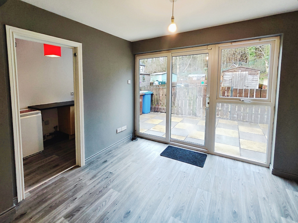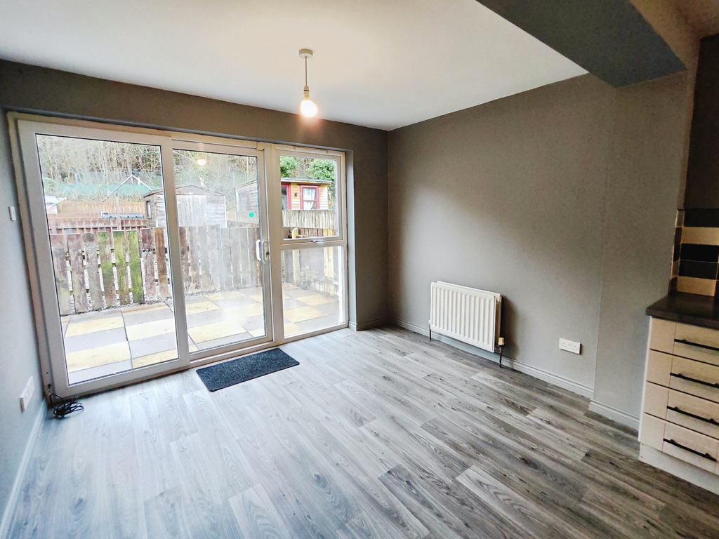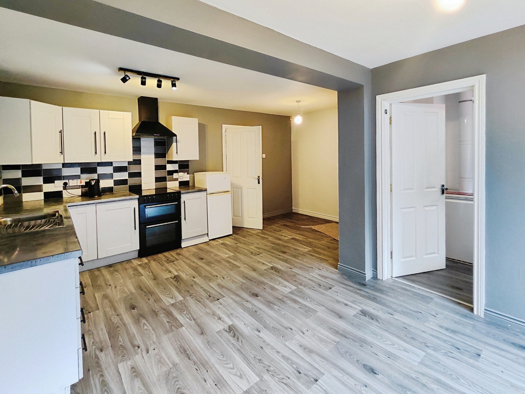 With fully fitted range of eye and low level units with tiling between, stainless steel sink unit, space for cooker with extractor fan, TV and telephone points, patio door to rear. Measurements to widest points.