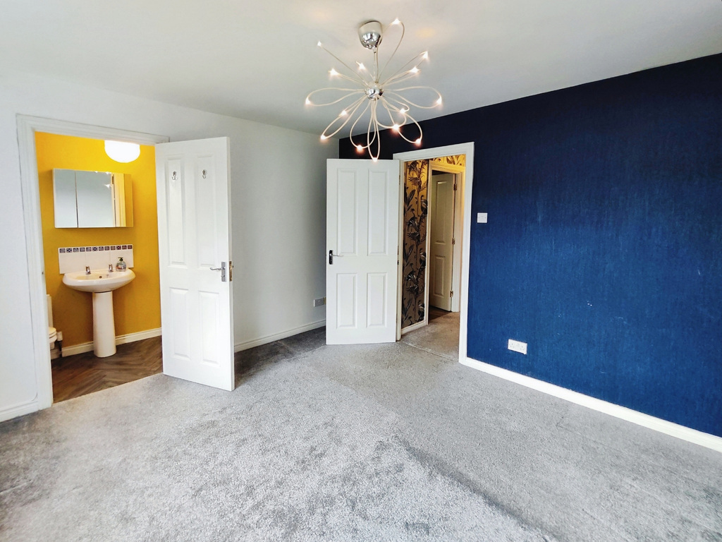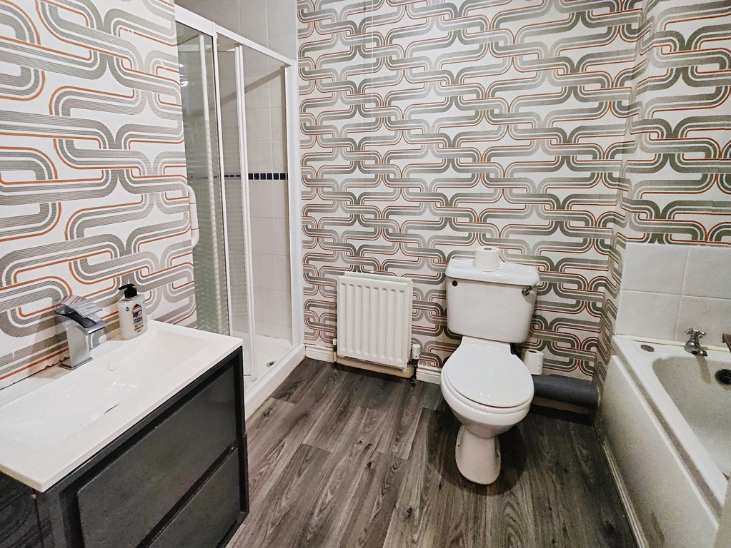 En-suite comprising fully tiled walk in shower cubicle, wc, wash hand basin and extractor fan.