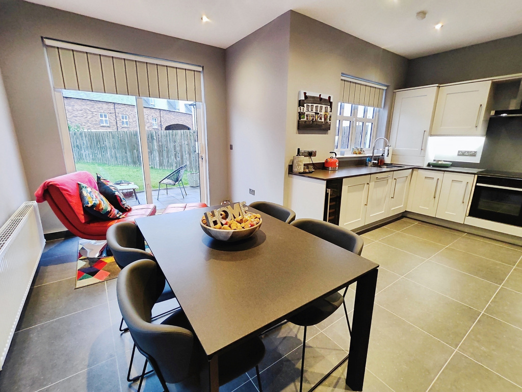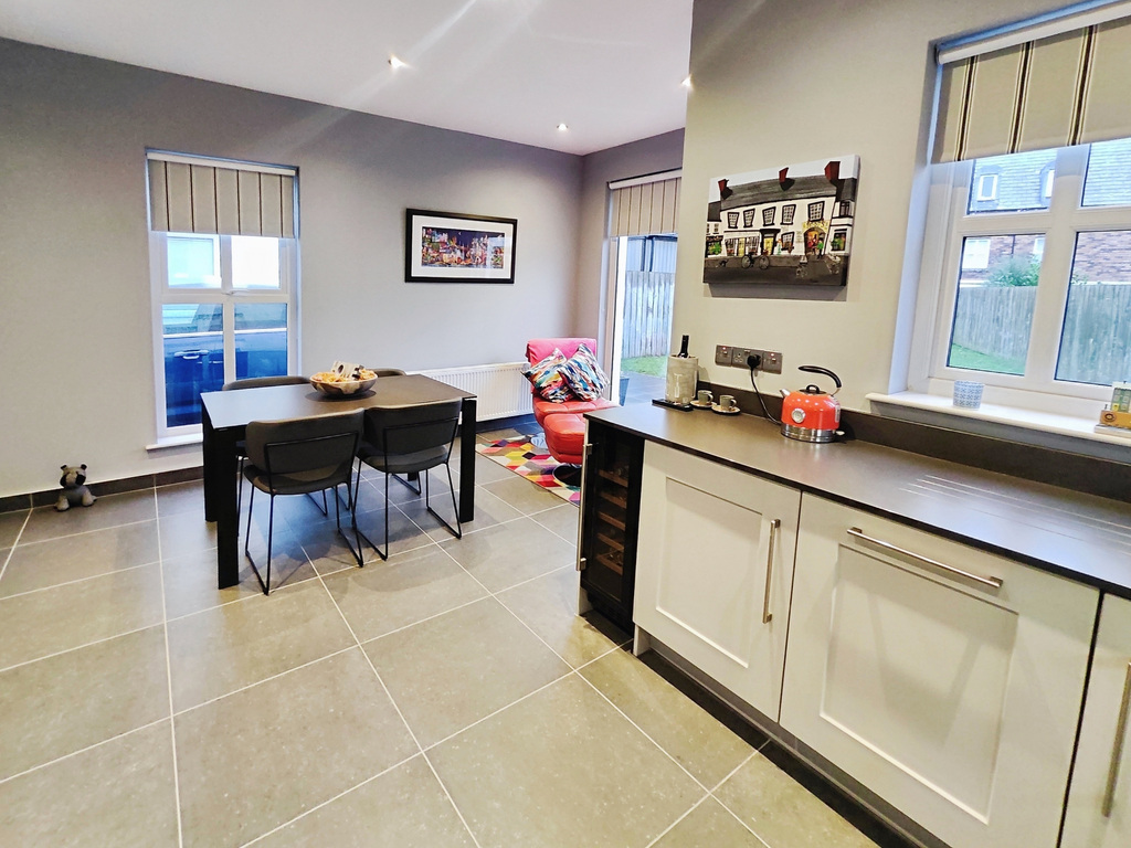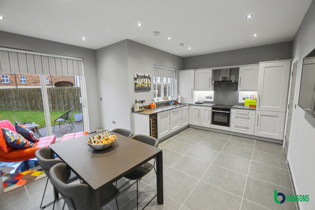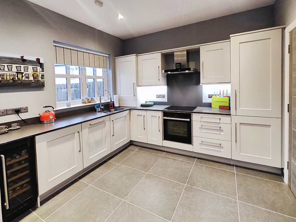 (L Shaped Measurement to Widest Point ) With a range of eye & low level units, grey quartz worktop with upstands, 1 1/2 bowl sink unit, concealed lighting, integrated 'Neff' hob and low level oven with extractor fan overhead, integrated 'Bosch' dishwasher, integrated fridge freezer, wine cooler, recessed ceiling lights tiled floor with upstands and slider door into garden.