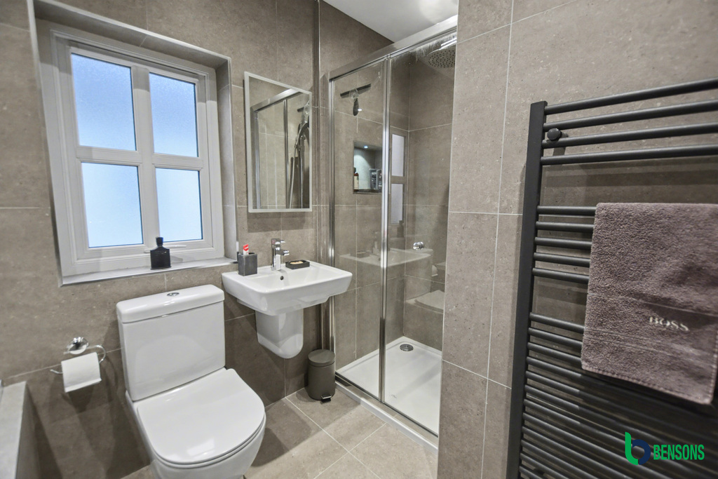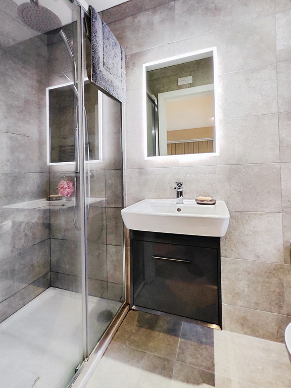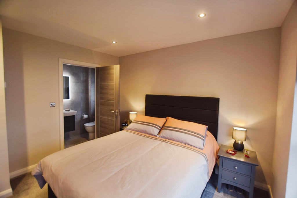 With recessed ceiling lights and TV point. En-suite comprising of WC, floating wash hand basin, fully tiled walk-in mains shower cubicle with waterfall head, recessed shelf with down lighting and chrome trim, extractor fan, LED mirror, tiled floor and fully tiled walls.