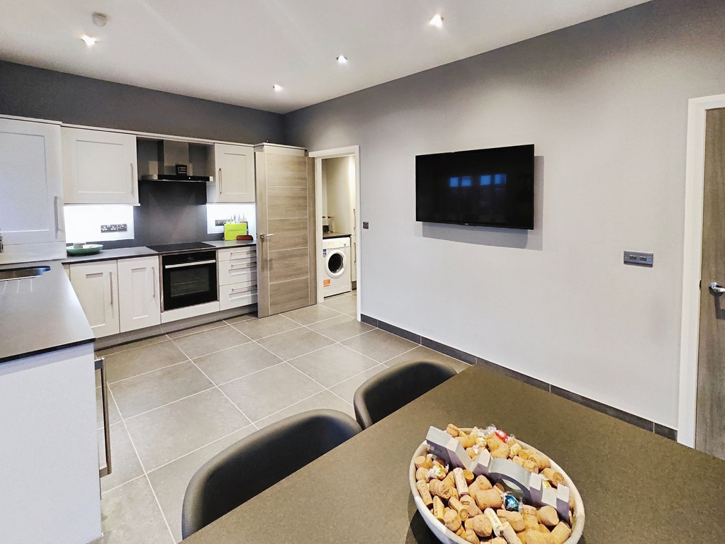 With eye & low level units, grey quartz worktops with upstands, space and plumbing for washing machine & tumble dryer, recessed ceiling lights, extractor fan, tiled floor with upstands.