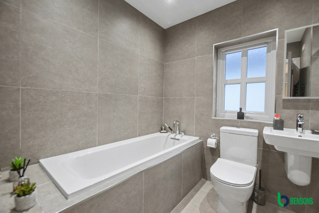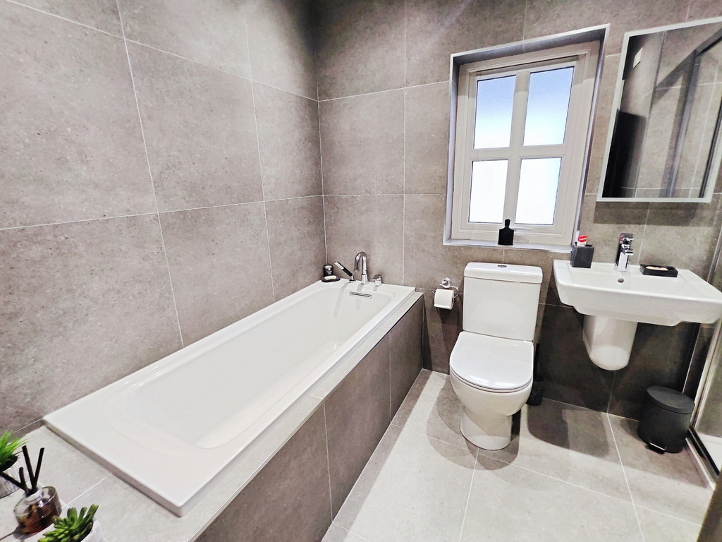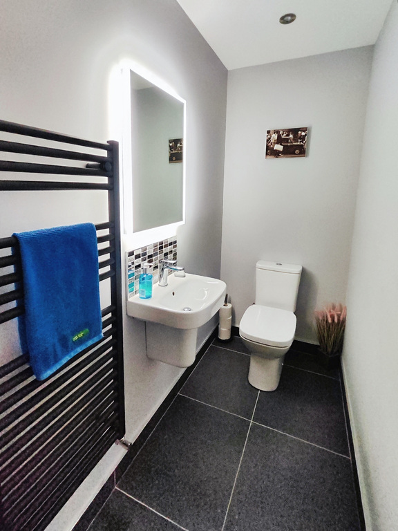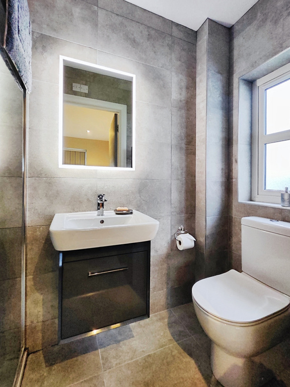 With recessed lighting, tiled floor with upstands, points for wall lights. Cloakroom comprising of WC, floating wash hand basin with tiled splashback and chrome trim, recessed ceiling lights, LED mirror, extractor fan, heated towel rail, tiled floor with upstands.