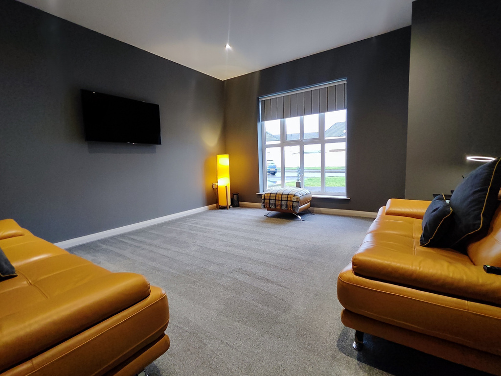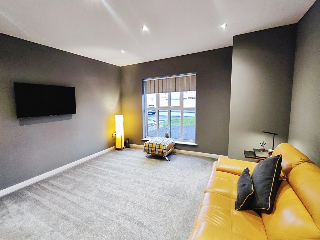 With recessed ceiling lights and provision for wall mounted television.