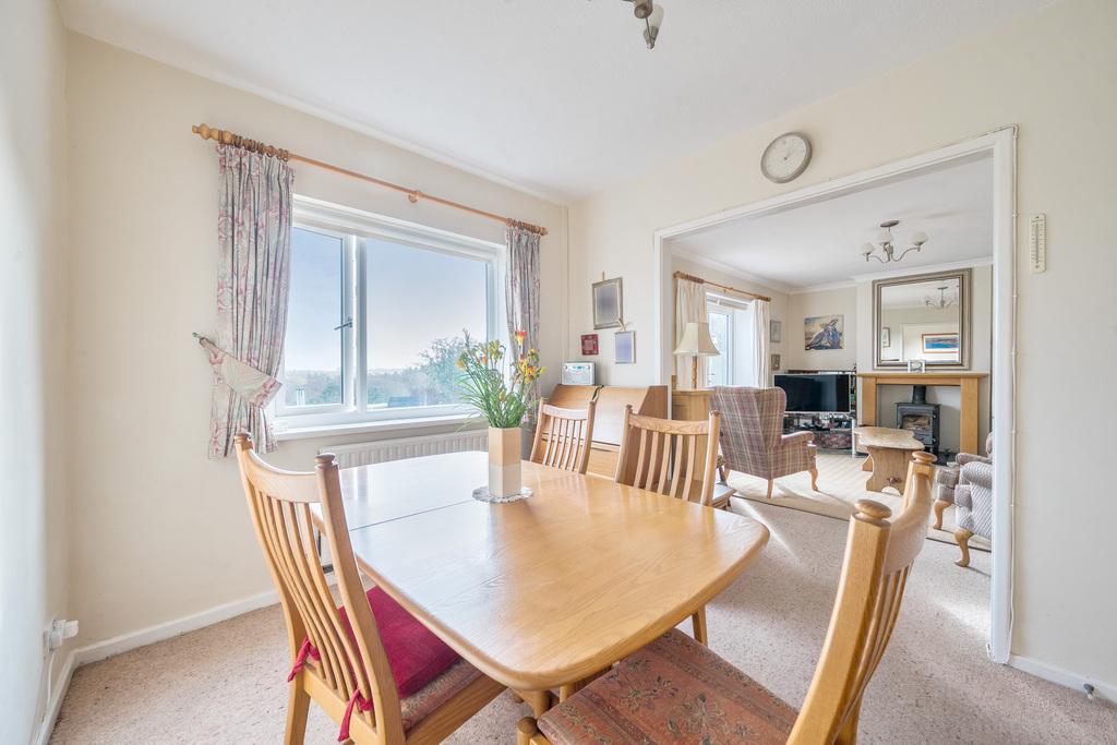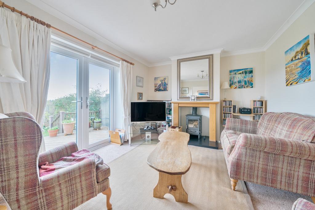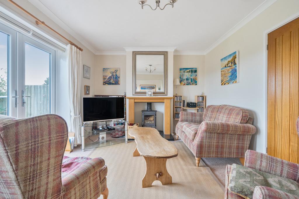 The kitchen is well considered and practical. From here, the house opens into the main living spaces: a dining area, with an archway linking through to the sitting room. A wood-burner forms the focal point, and French doors draw you straight out to the rear deck, with the countryside beyond.