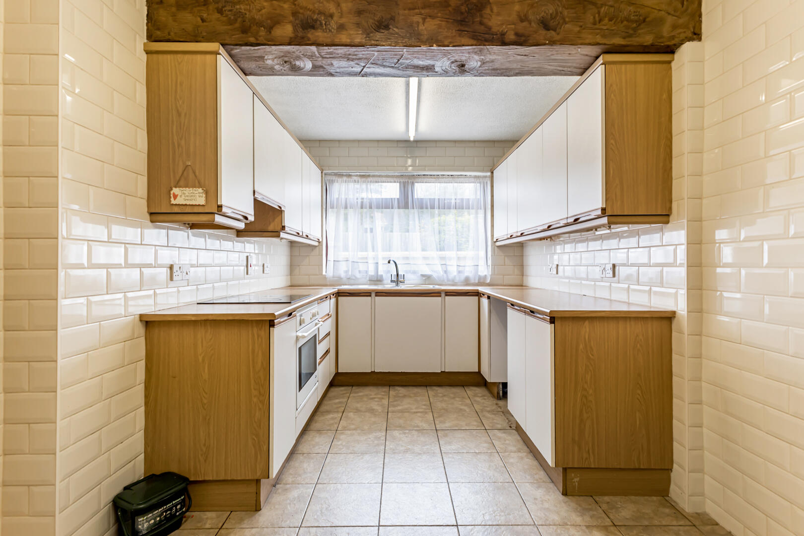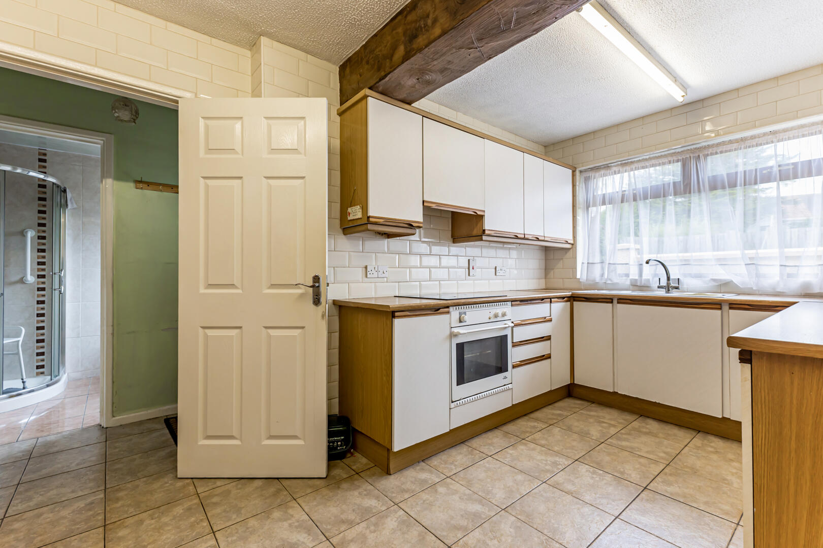 Kitchen/Dining - 4.80m x 2.69m (15'9" x 8'10") - Porcelain tiled floor, tiled splashback, outlook to the rear, under stair storage, exposed beam, range of low- and high-level units with laminate worktop, space for washing machine, 1 ? stainless steel sink and drainer with chrome mixer tap, Thor electric oven and grill, four ring Logik electric hob, extractor fan