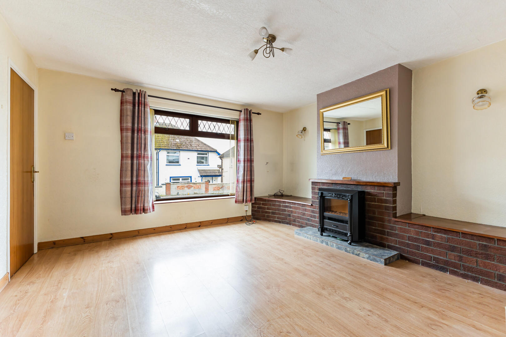 Family Lounge - 3.76m x 4.45m (12'4" x 14'7") - Outlook to the front, wall lights, laminate wood flooring, feature electric fire with wood beam mantel, red brick surround and tiled hearth
