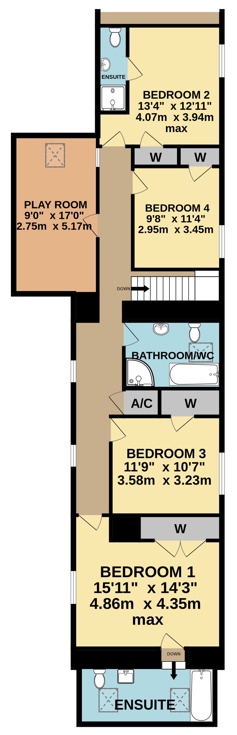 Play Room 9' x 17' (2.74m x 5.18m).