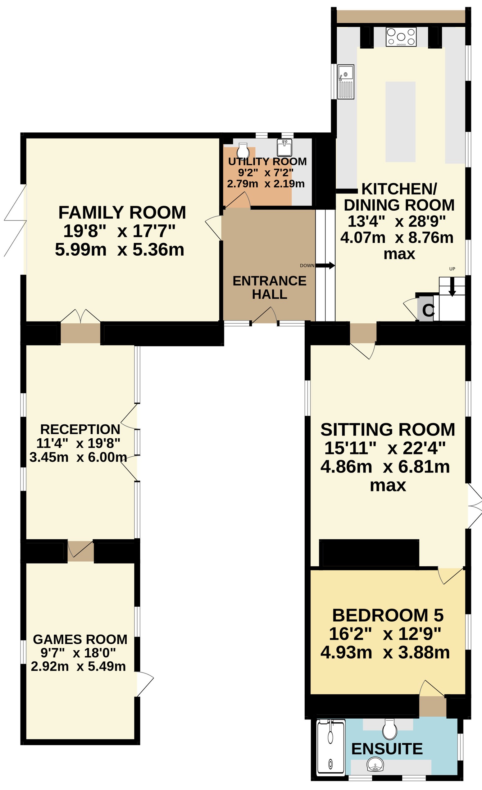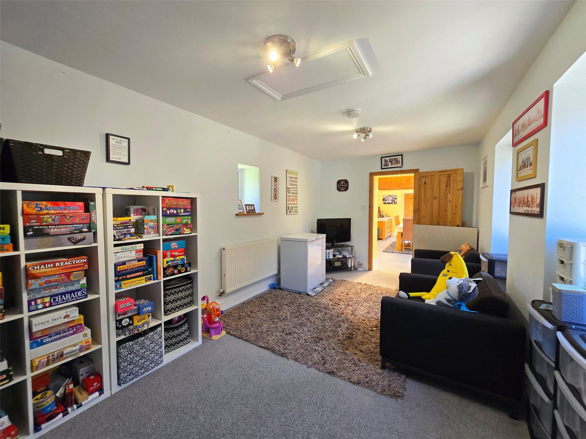 The family room has a favourable south facing orientation and a light well flooding the room with natural light. There is luxury vinyl flooring, stunning vaulted ceiling and bi-fold doors which access the rear garden. The family room leads through to the dual aspect workshop which has a polycarbonate roof, glazed sides and is currently used as a formal dining room. The adjacent games room has an external door and both the workshop and games room has potential (subject to obtaining all necessary consents) to collectively become an annexe or work from home space. Concluding the ground floor is the fifth bedroom suite which has an en-suite shower room/WC with a double shower and plenty of built in storage.
