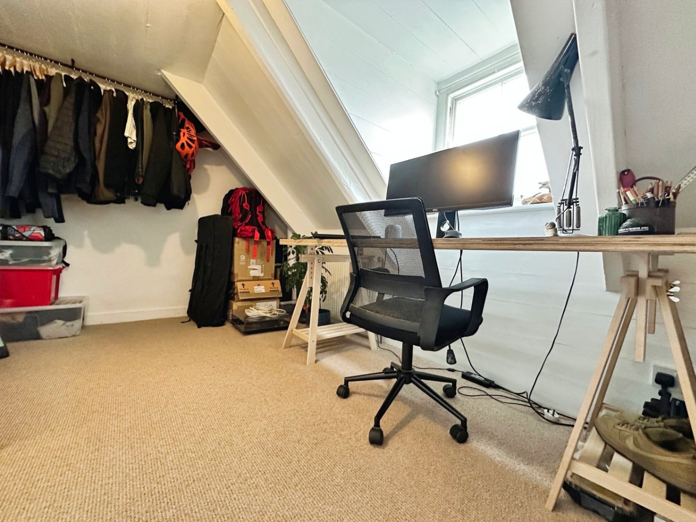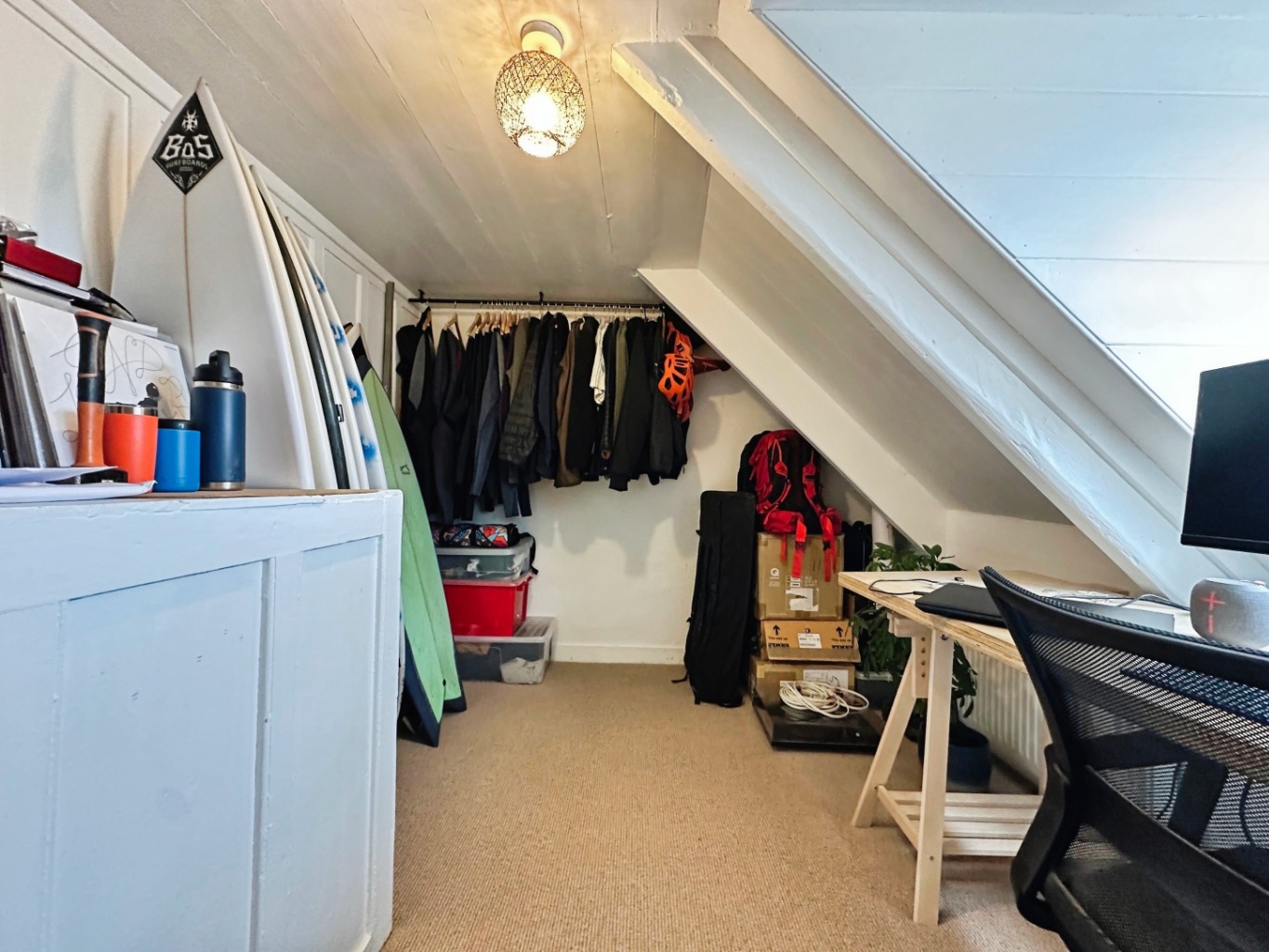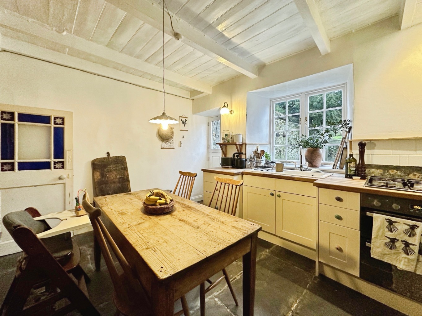 The ground floor features a characterful kitchen with a traditional Cornish Range (not currently in use), alongside a spacious sitting room complete with an open fire, creating a warm and inviting atmosphere. To the first floor, there are two bedrooms and a bathroom, while the second floor provides two further attic bedrooms, offering flexible accommodation for family living, guests, or home working.