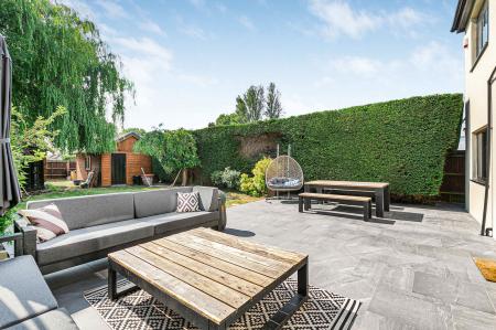 The rear garden is flat and family-friendly, featuring a large patio area ideal for summer barbecues or relaxing outdoors. To the front, a private driveway provides parking for multiple vehicles.