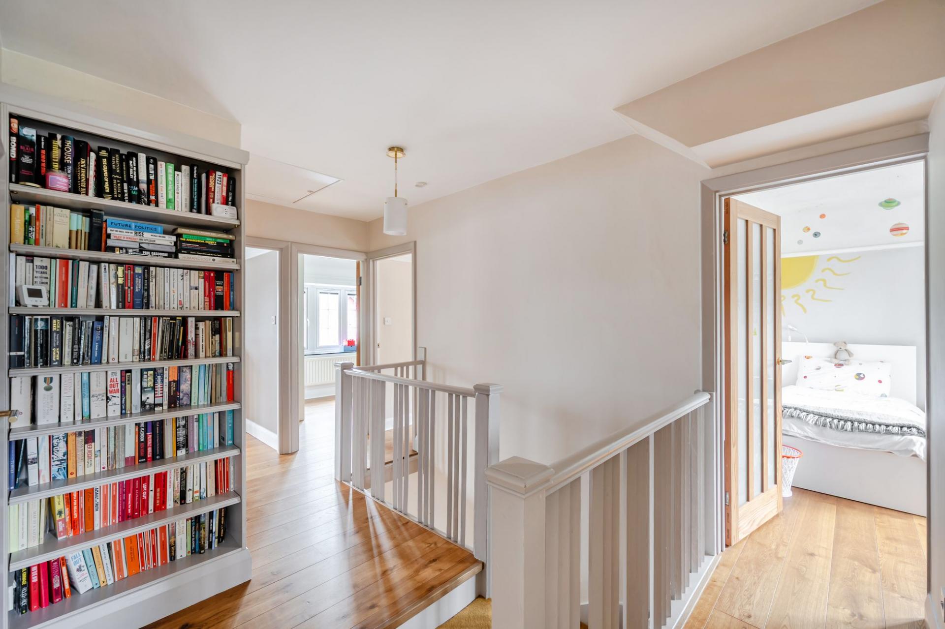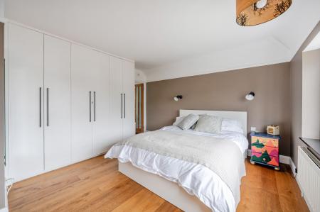 Upstairs, the principal bedroom features fitted wardrobes, wooden flooring, and a stylish en‑suite shower room. Four further bedrooms provide ample space for a growing family, guests, or home working. There is also a family bathroom.