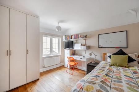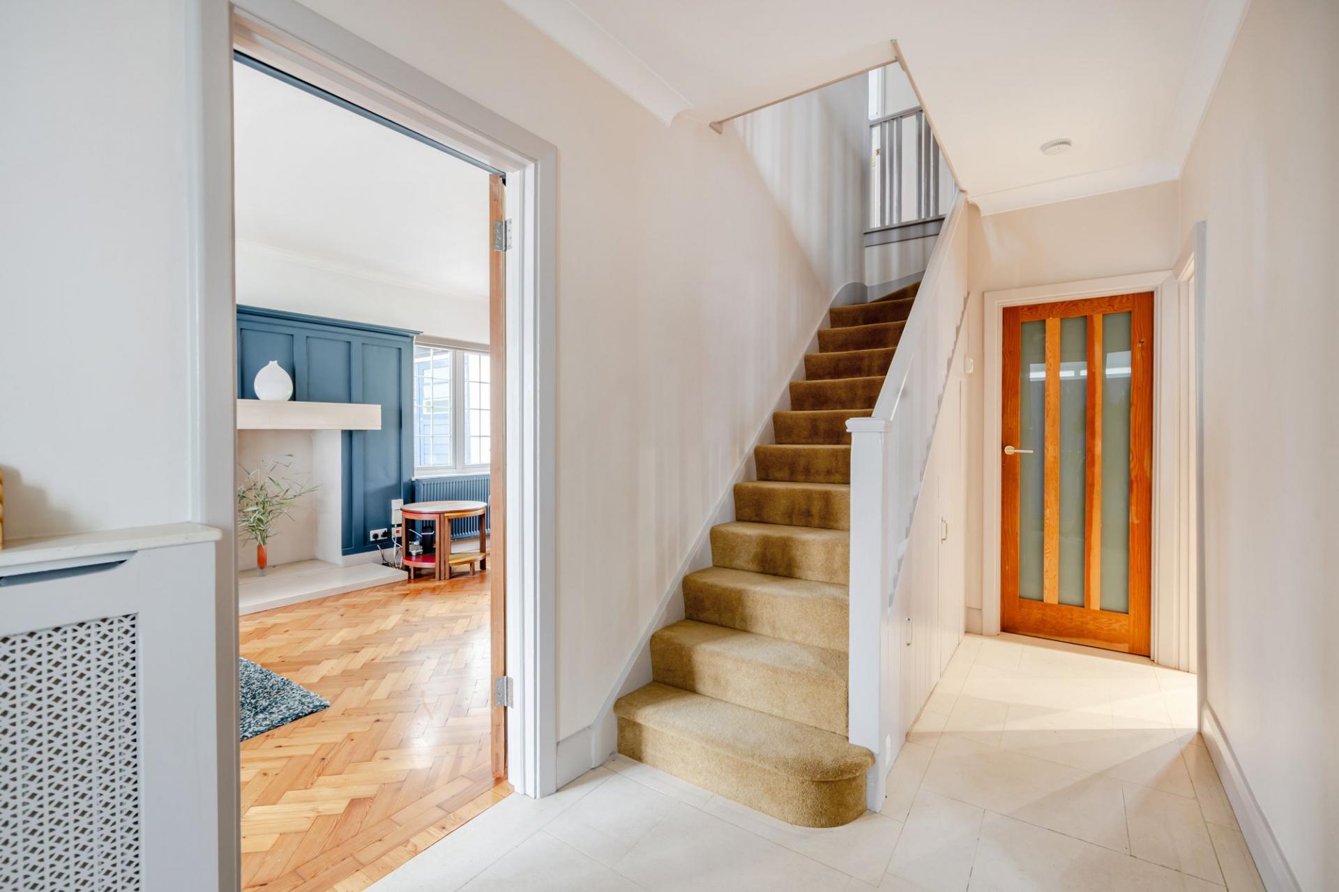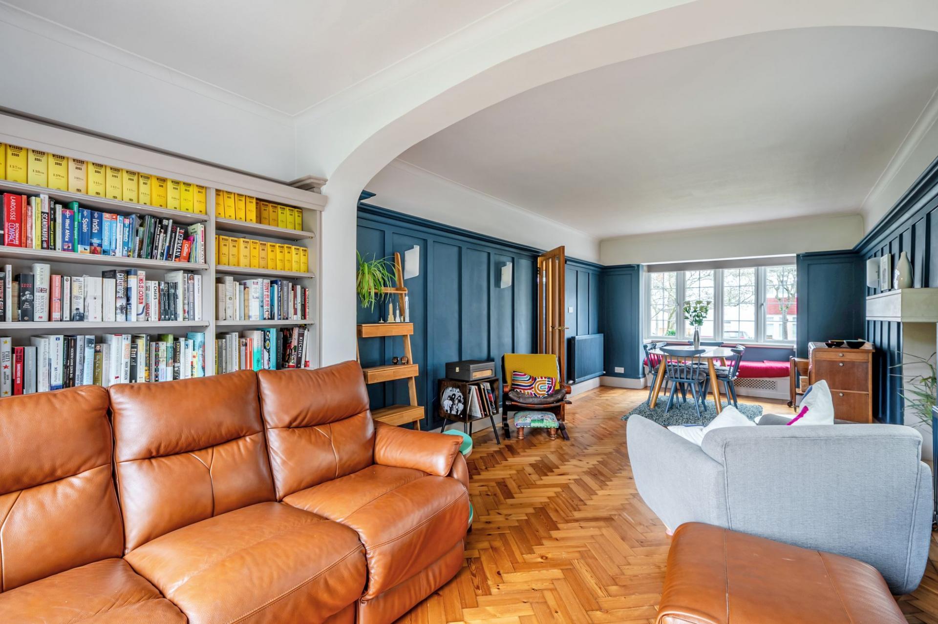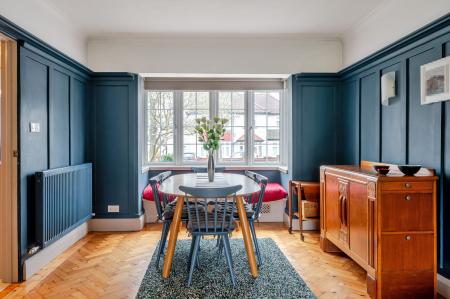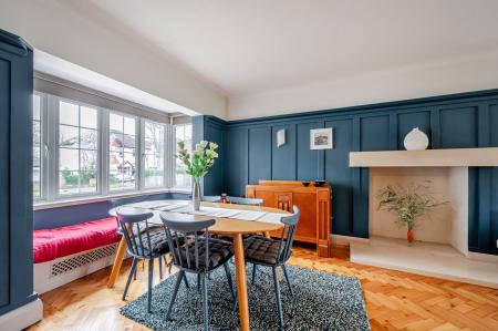 The triple‑aspect sitting room is a true highlight of the home — light, elegant, and rich in character. It features polished wooden herringbone flooring, wood‑paneled walls, and a feature fireplace that creates a refined yet homely ambiance. There are windows to the front and side, together with patio doors leading directly out to the garden.