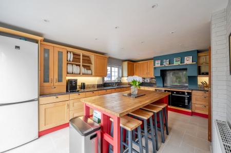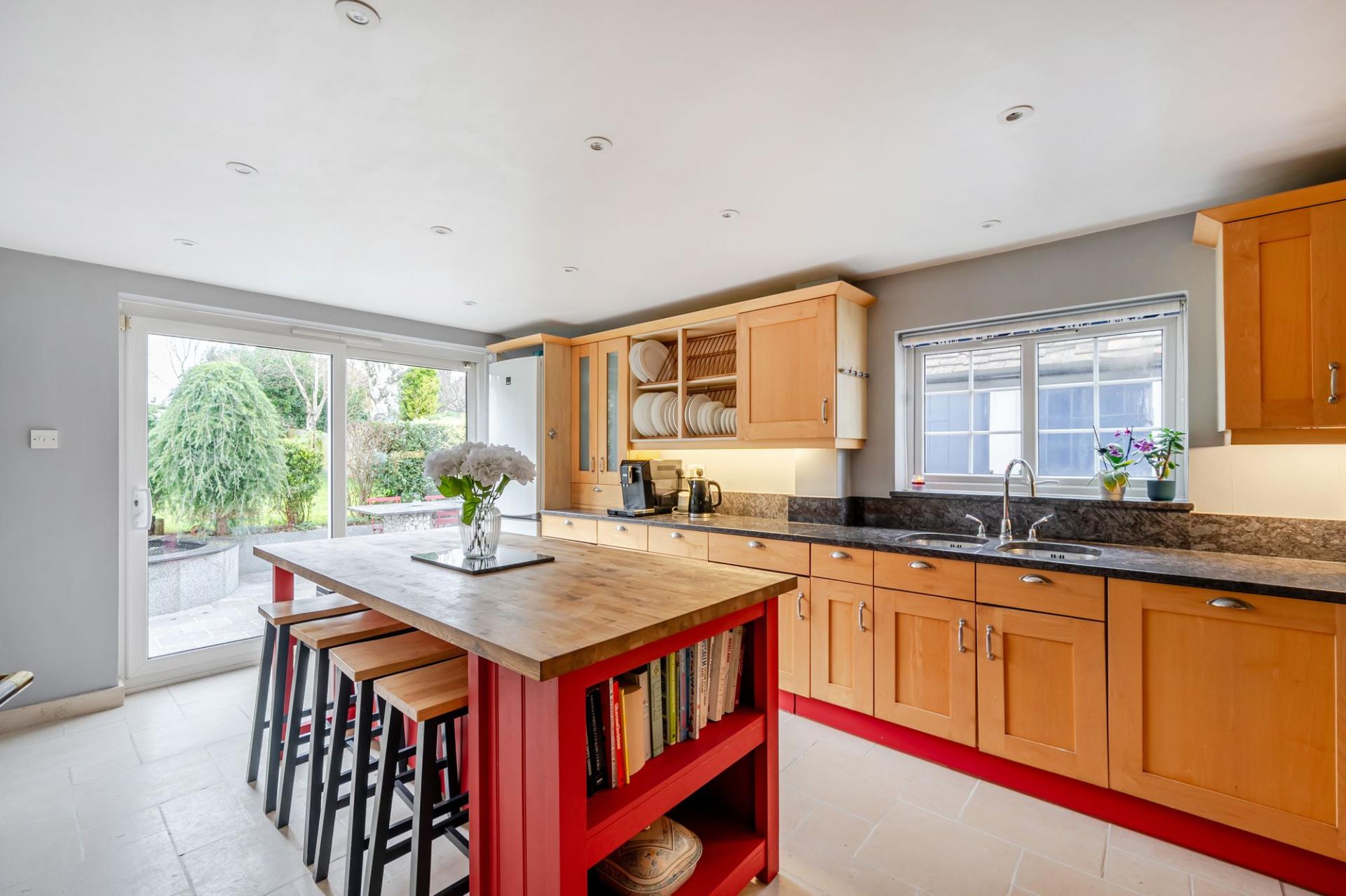 The kitchen is both practical and charming, fitted with a comprehensive range of units and a central island topped with a solid wooden work surface. Integrated appliances, including a dishwasher, built‑in oven, and electric hob, make everyday life easy, while sliding patio doors open directly to the rear garden. A useful adjoining utility room provides space for laundry and additional storage.