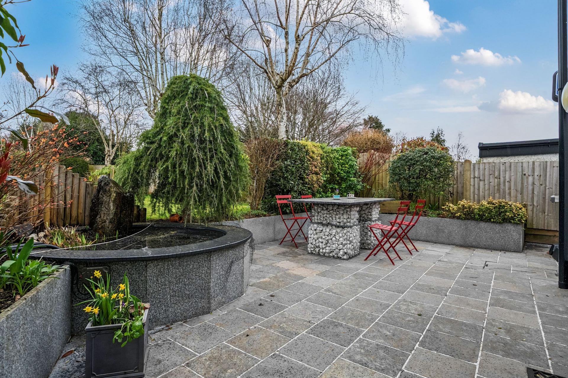 The rear garden is a wonderful outdoor retreat — large, level, and beautifully mature, offering privacy and tranquility. A spacious patio area provides the ideal spot for summer barbecues and family relaxation, while the generous lawn, shrubs, and established trees create a delightful backdrop. There is also an ornate fish pond, gardener’s WC, and garden shed for convenience.