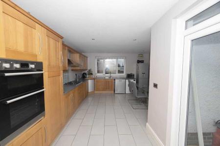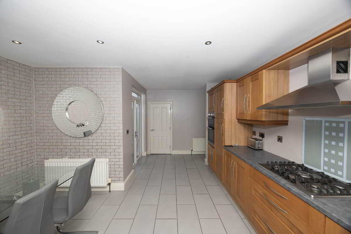 The kitchen and dining area is bright, practical, and well-proportioned, offering an abundance of solid wood high and low-level units and excellent worktop space. This is a kitchen designed for real family living.
