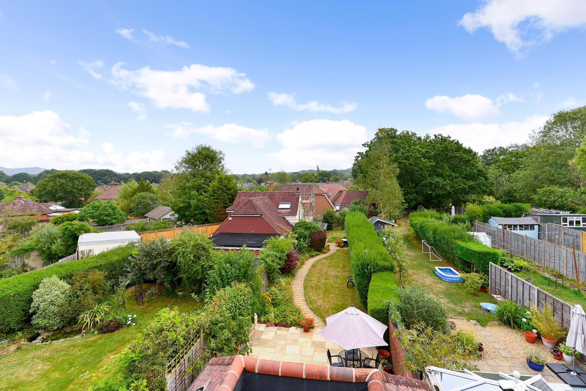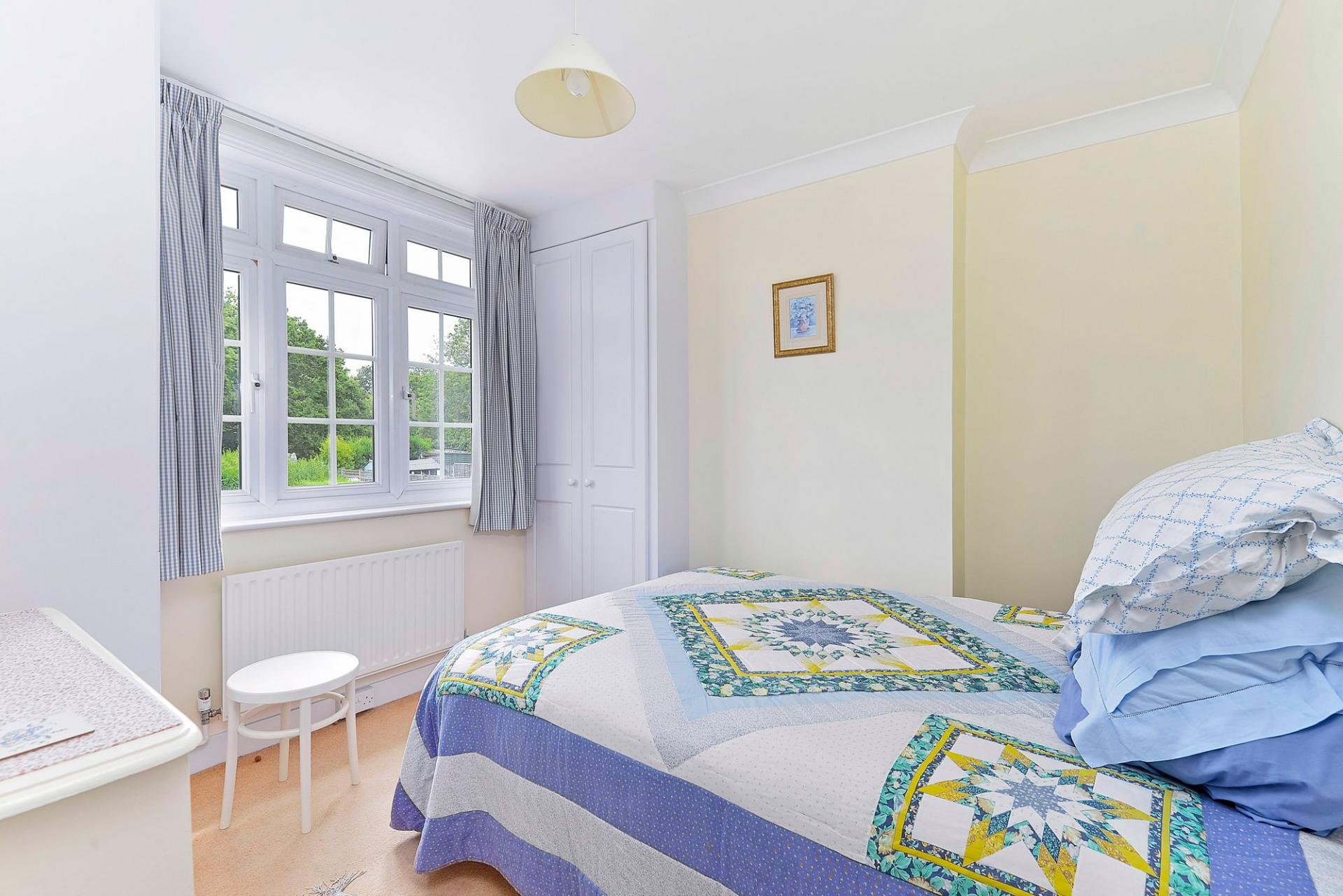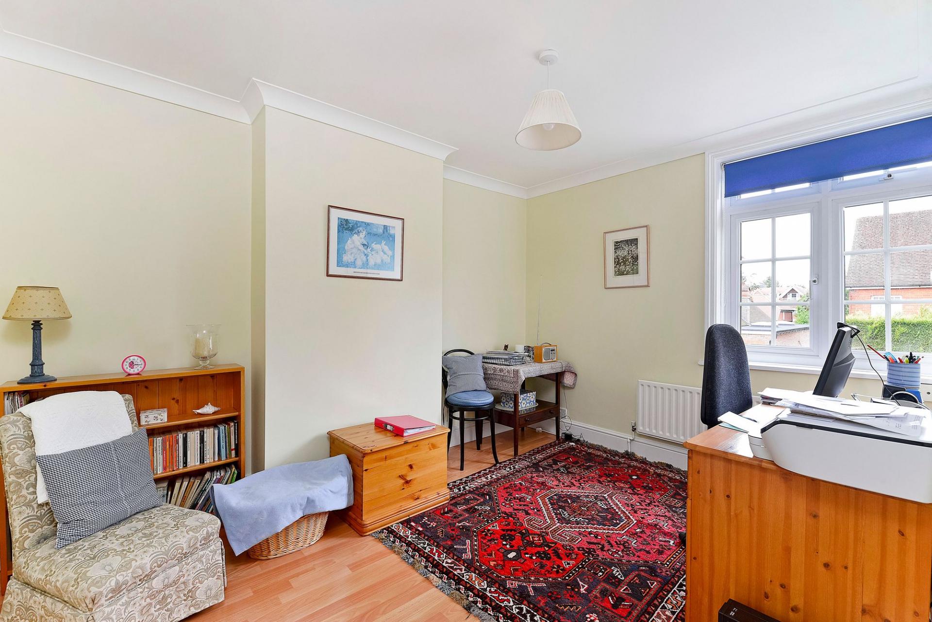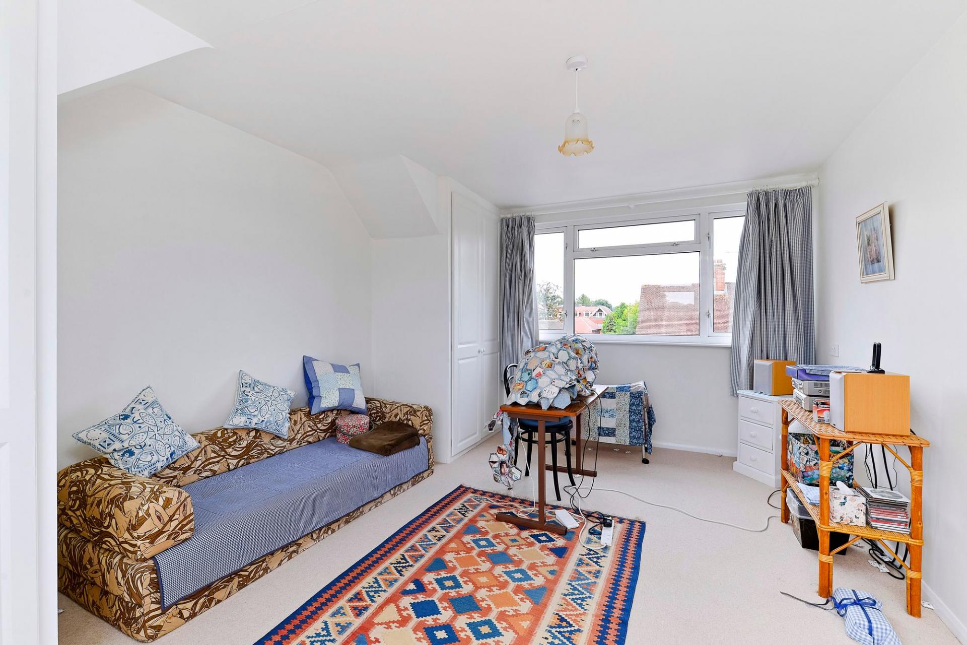 Upstairs, the first floor hosts two good sized bedrooms, including a principal bedroom with elegant proportions, and a third bedroom suited for guests or home working. The second floor reveals a charming attic-style bedroom with eaves access and storage, offering a peaceful retreat with leafy distant views towards the Surrey Hills. With an approximate gross internal area of 1,232 sq ft, the home is both spacious and inviting.